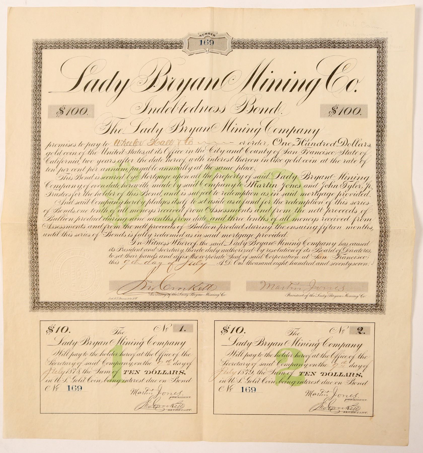 Bonds for this company have not seen by us before! The Lady Bryan was a mine located on the Flowery District, Six Mile Canyon, Storey County. This $100 bond, No. 169, is issued to Wheeler Hall & Co. on July 9th, 1877. Signed by president Martin Jones and secretary John Crockett. Not cancelled. Printed by G.T. Brown & Co., S.F. Two bond coupons attached. G.T. Brown was a noted African-American lithographer in San Francisco. This bond is not listed in Chandler. Bond states that it will be repaid from 1/10th of funds from assessments and bullion. 13 x 12.5" Horizontal and vertical folds. () Ken Prag Collection