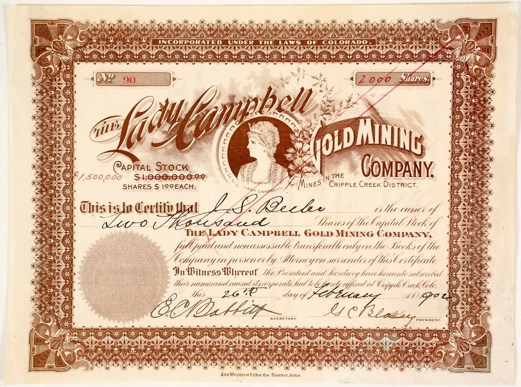 Mines in the Cripple Creek District (printed below logo). Inc. in Colorado. No. 90, issued for 2,000 shares to J.S. Beeler on Feb. 26th, 1902. Signed by G.C. Blakey, president, and E.C. Babbitt as secretary. Pen cancelled. Very attractive design with maroon border and print and a vignette portrait of Lady Campbell. Printed by The Western Litho Co, Denver. 7.75 x 10.5" Folds, soiling (water damage?) to bottom right (most evident on reverse of stock). The Lady Campbell claim was located on Galena Hill. Also owned the Jorado (Galena Hill), the Emma Abbott (Womack Hill), and Jack the Ripper (Mineral Hill). [Ref: Cripple Creek Manual]  City: Cripple Creek  State: Colorado  Date: