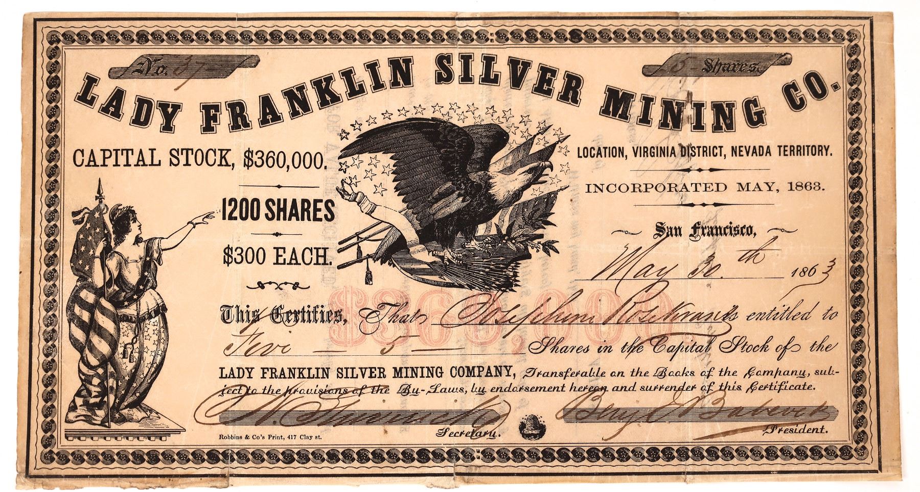 Lady Franklin Silver Mining Co. - Virginia District, N.T. - Certificate No. 37 for 5 shares of stock dated May 30, 1863, and made out to Josephine Rosecrans. Incorporated in San Francisco in May, 1863 and capitalized at $360,000; 1200 shares at $300 per. Signed by president, Benjamin E. Babcock (Scott & Babcock, S.F.) and secretary, xxxxx. Vignette of an Eagle, flag, shield and arrows at top center and another with a woman wrapped in a flag. Red overprint “$360,000”. Printed by Robbins & Co., 417 Clay St., S.F. Virginia City Nevada Franklin Collection
