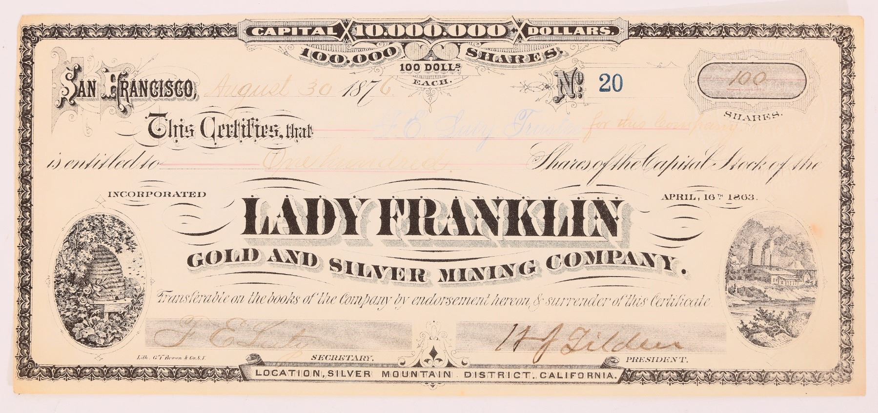100 shares made out to F. E. Luty, Trustee for the Company dated August 30, 1876. The Company was capitalized at $10,000,000; 100,000 shares at $100 each and incorporated on April 16th, 1863. Signatures include F. E. Luty, Secretary and H.J. Tilden, President. Named after Lady Jane Franklin, 1792-1875, wife of English Arctic Explorer who searched for the Northwest Passage. Black and white with vignette of beehive at left and a mill at right. Embossed seal in right corner indicating name, location and incorporation date. Lith. by G.T. Brown & Co. S.F., the first western African-American lithographer. S.F. Fine condition. Reference: item # 443 The Alexandra Tillson Filer Collection Part I auction catalog February 26, 2000 Fred Holabird Americana. Also see Pacific Coast Annual Mining Review and Stock Ledger October 1878, p.211. Uncanceled.