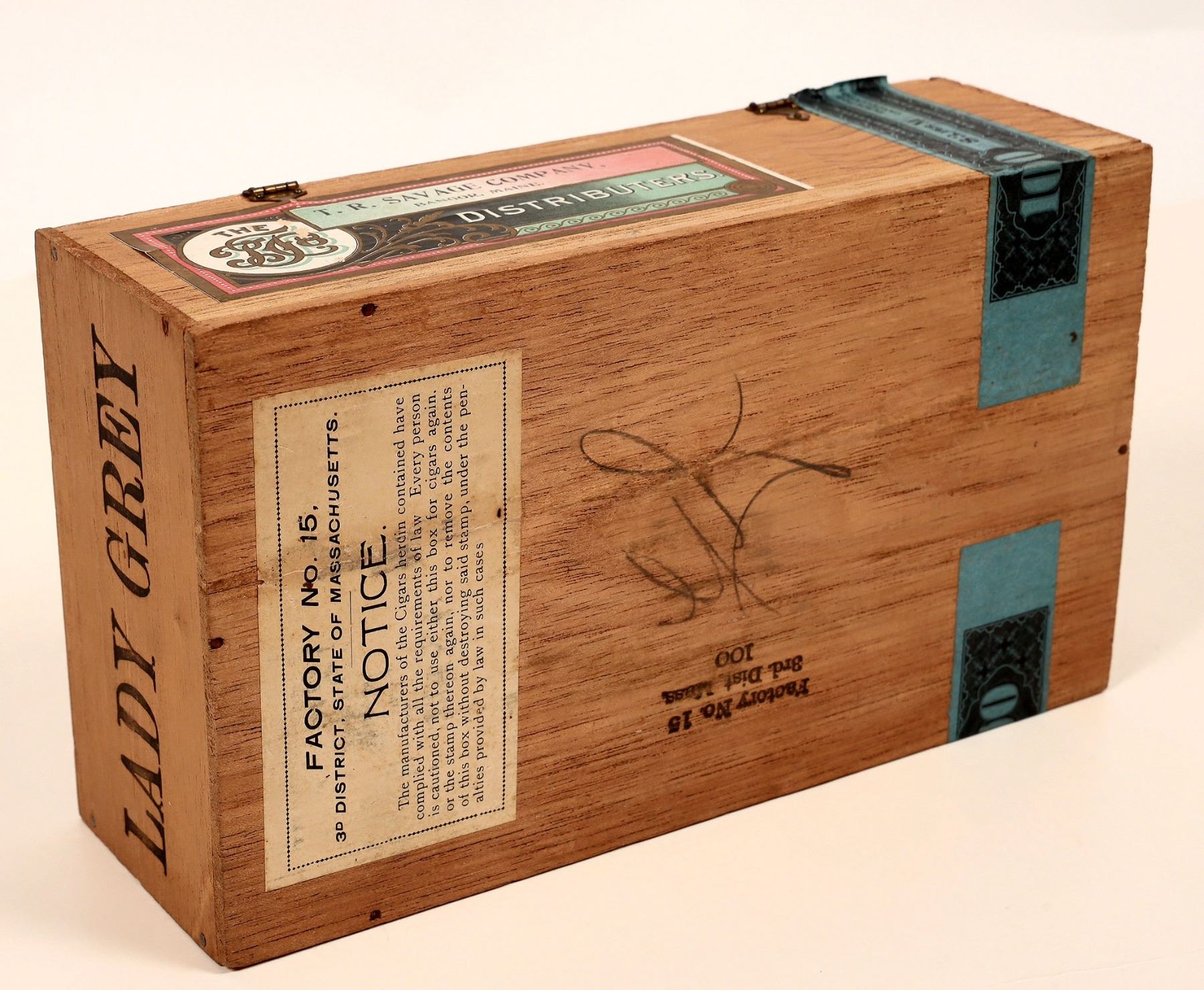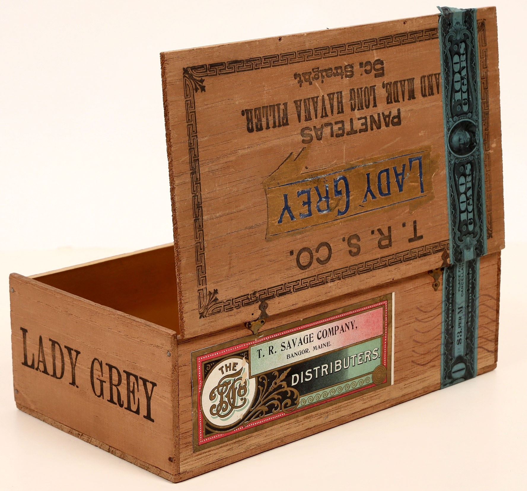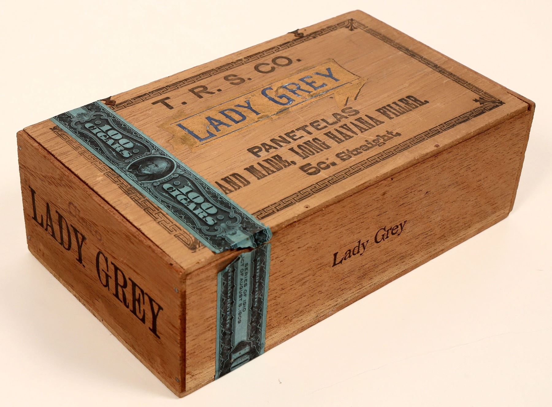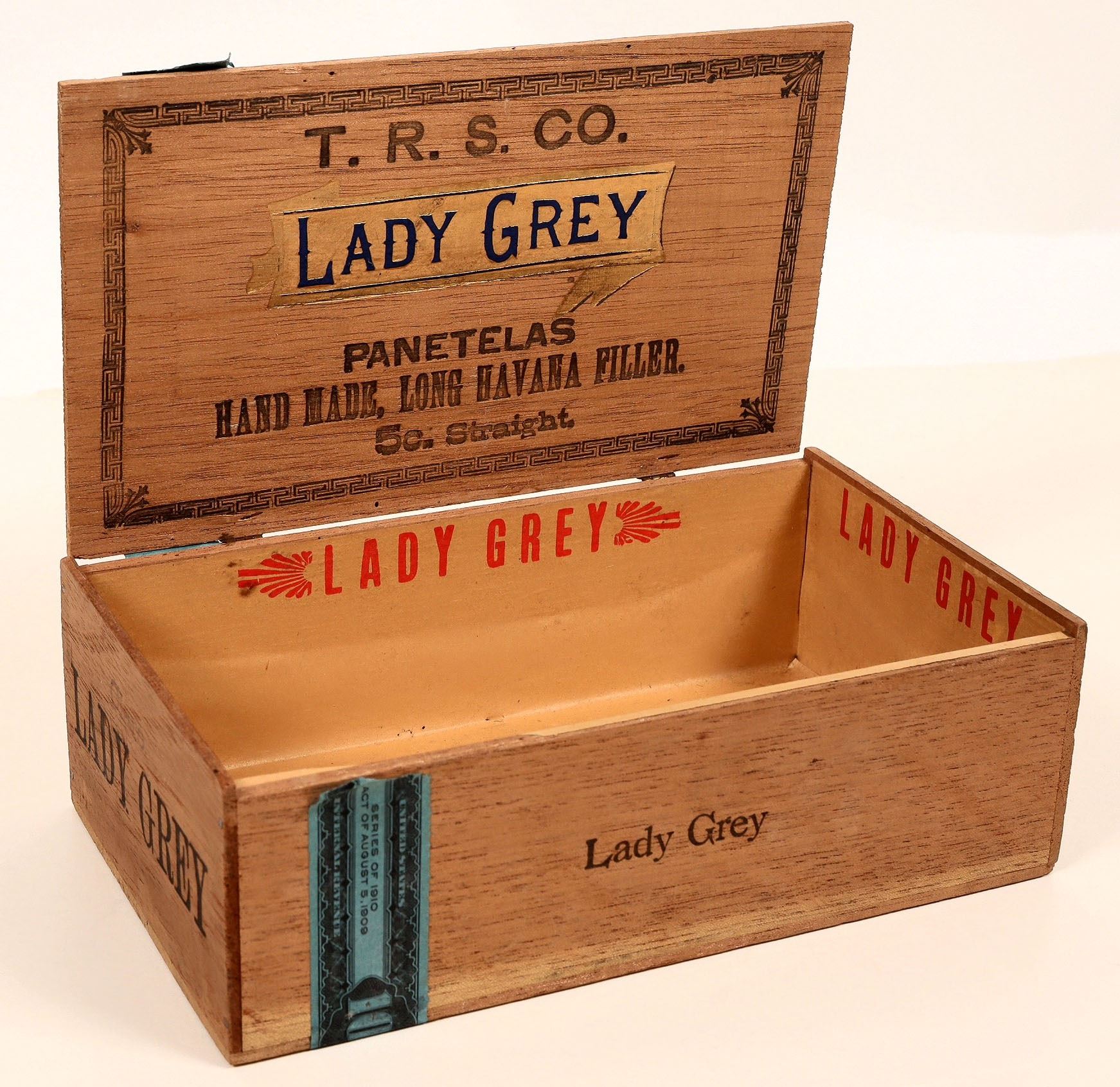 Wood cigar box, dated 1910. It once held T.R.S. Company Lady Grey panetelas. They were sold for a nickel a piece. Box measures 9.5"x 5.5" by 3". There is an IRS customs band attached. Please see photos for more details.