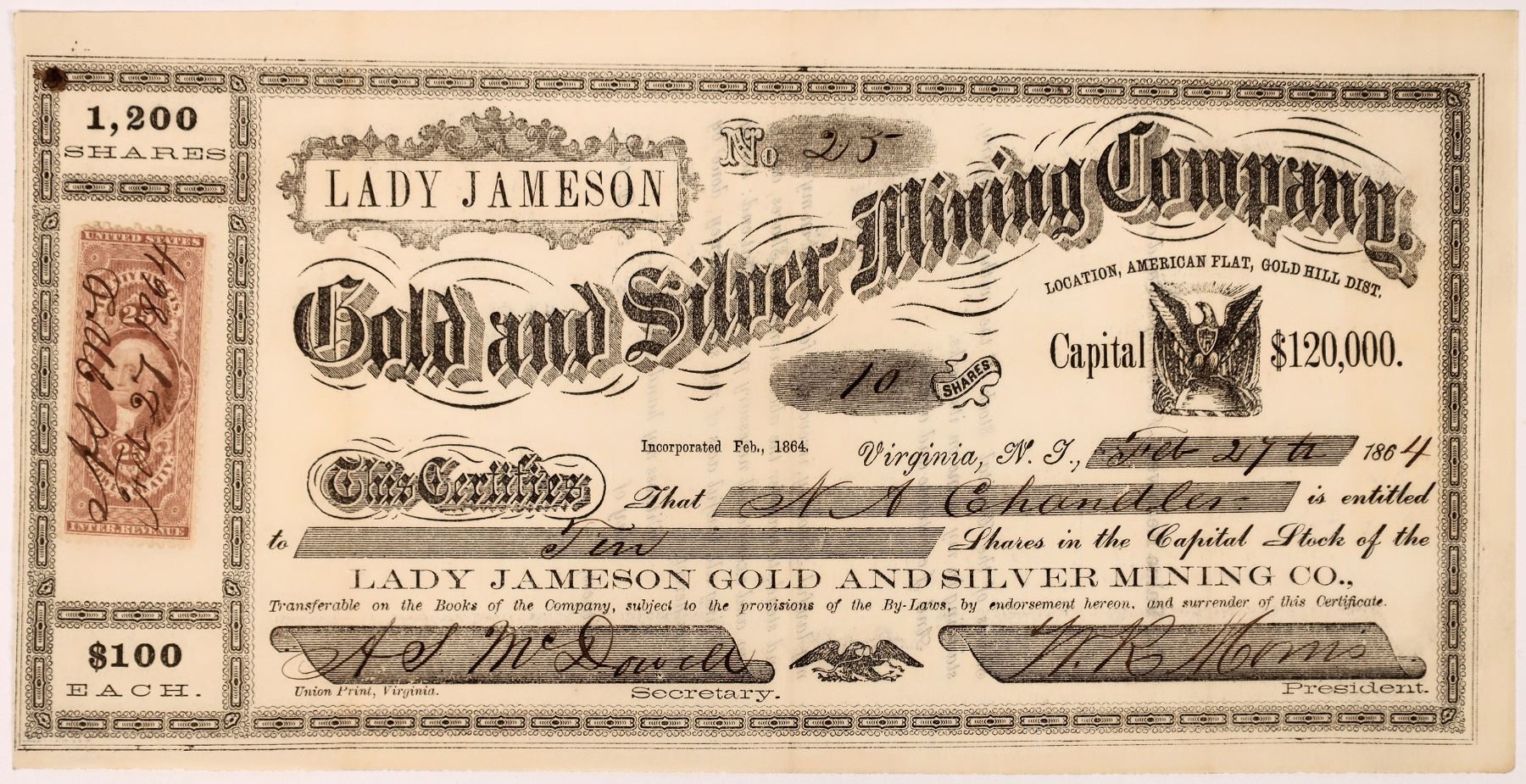Lady Jameson Gold and Silver Mining Company Stock Certificate - American Flat, Gold Hill District, Storey County, N.T. - 1864 - 9.50 x 4.75. Incorporated February 1864. Cert #23 issued to N.A. Chandler on February 27, 1864, for 1,200 shares. Signed by Secretary A.S. McDowell and President N.R. Mims. Capitalized at $120,000; 1200 shares at $100 per. One 25-cent, red R48, R4, hand tied, adhesive, perforated, U. S. Power of Attorney stamp located on the left side. Listed in Collins's Mercantile Guide and Directory for Virginia City, Gold Hill, Etc.. 1864-65, p. 363. Located South of Gold Hill in the American Flat area. The name of the flat was reported to have come from Emanuel Penrod, a friend of Henry Comstock. Penrod remarked on the flat being first mined by Americans opposed to other areas around the Comstock [Ref: Carlson, Nevada Place Names, 1974, pp. 37, 123]. Union Print, Virginia (rare). Folds present and little wear on the sides. U/C.