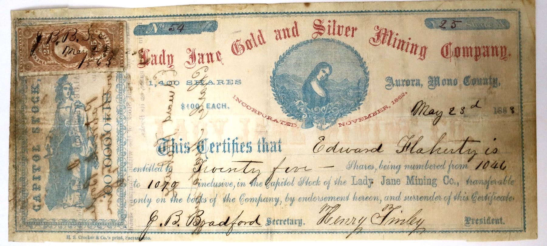 # 54 for 25 shares to Edward Flaherty (numbers 1046 to 1079). Signed by JB Bradford and Henry Finley president. Dateline Aurora, Mono County 1863. Incorporated November 1862. 25c Protest revenue stamp. Not cancelled. HS Croker & Co. printer. Two lady vignettes. Blue and red on off white. Underprint red Lady Jane Mining Co. Assigned to Patrick Boyle on back. Faded with age, toning, some edge issues. One of the original locations on Silver Hill, according to Stretch (1866). A patented mine, and one of the richest veins, according to Hill. Parallel to the Antelope. The Lady Jane is located west of the Antelope on Silver Hill. Copies of Sacramento Bee from April to June listing the Lady Jane in the stock market. Flaherty, Bradford (butcher) and Finely Finley all listed as living in Aurora in 1863.