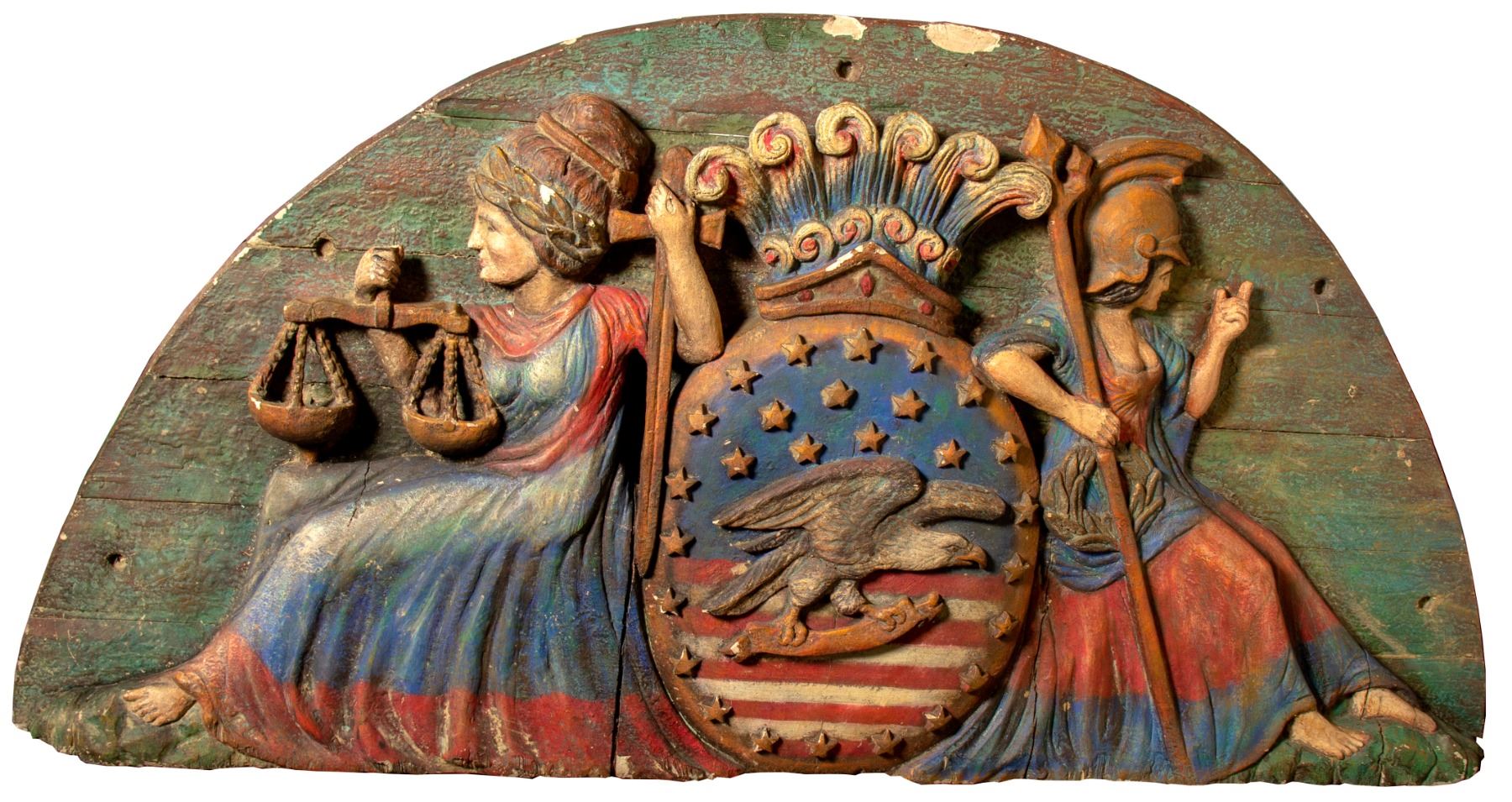 Large 81 x 41" half-round early casting from a wood original of what may be an aftcastle for a clipper ship. The original, based upon the 28 stars present, would date to 1845-1846, thus correlative with the California Gold Rush. The piece appears to be about 1900, but could easily have been made for a display at the Pan-Pacific Expo in San Francisco in 1915. It appears to have been made to hang from a wall, possibly above the header, which would thus mark a "grand entrance." We were unable to find any marks on the back of the piece, and it came out of a building in San Francisco,. Lady Justice at left, the Eureka figure at right, Clearly a California piece. State: California City: Date: HWAC# 84845