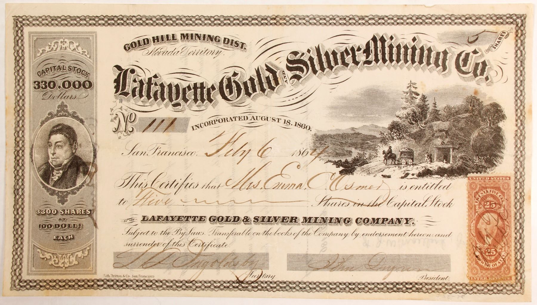 Incorporated August 18, 1860. Although listed in 'Nevada Territory' in 1860 this area was still part of the 'Utah Territory.' This may seem like there is an error in printing as very few 1860 corporations are known. But the Sacramento Daily Union lists the Lafayette of Utah Territory incorporated in September of 1860. Number 111 to Mrs. Emma C Osmer. Signed by Ingoldsby (frequent secretary to mining companies) and president John (?). Dateline San Francisco February 6, 1864. Endorsed on back. Horse drawn ore cart vignette - unusual. Printed by Britton &Co. 25c Power of Att'y Revenue stamp. Not cancelled. Location: Gold Hill Mining Dist., Nevada Territory. Two small nicks upper right. Very fine! Prag Collection.