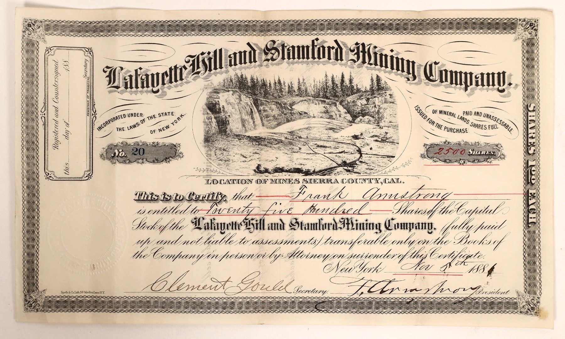 Rare issued 1881 Lafayette Hill and Stamford Mining stock. Issued to Frank Armstrong for 25 shares, signed by Clement Gould as secretary and F. Armstrong? as president. This was a short lived mining community in Lafayette Hill, 2 miles south of Grass Valley. Great large center hydraulic mining vignette. California