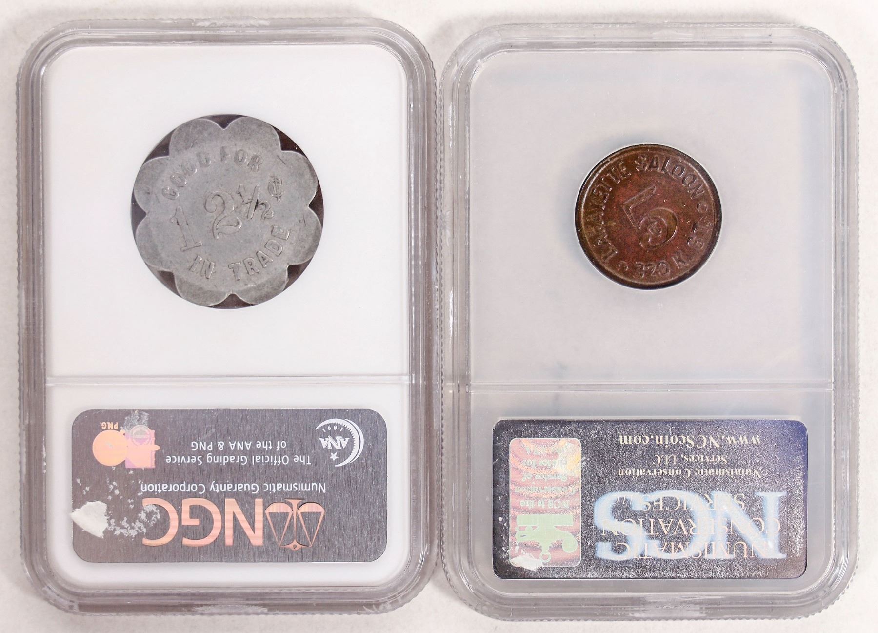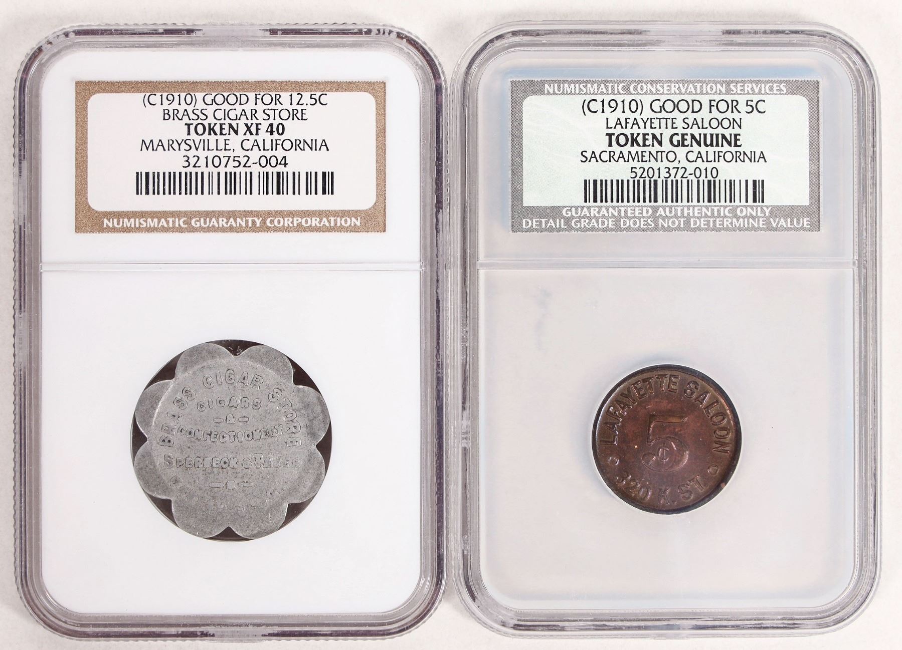 Two certified tokens: 1) NGC certified XF 40: BRASS CIGAR STORE / CIGARS / & / CONFECTIONERY / SPERBECK & TABER / MARYSVILLE, CAL. // GOOD FOR / 12Ω¢ / IN TRADE; Al., Sc 8, 28 mm. 2) NCS certified Genuine: LAFAYETTE SALOON / 5 / 320 K ST.