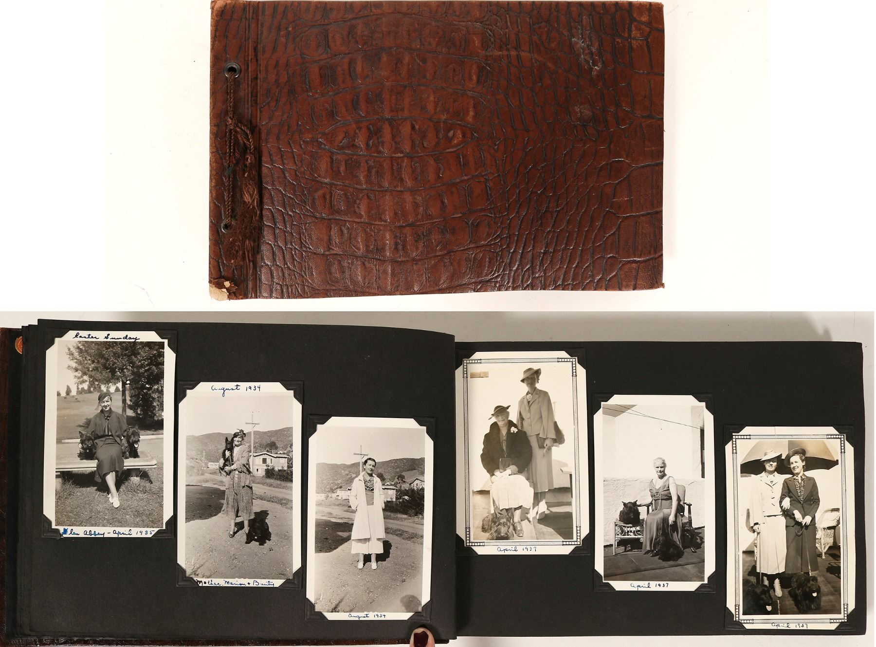 Alligator skin album with approx 70 small b/w California photos at the beaches, on a boat, various outdoor poses. Most dated. Nice set.
