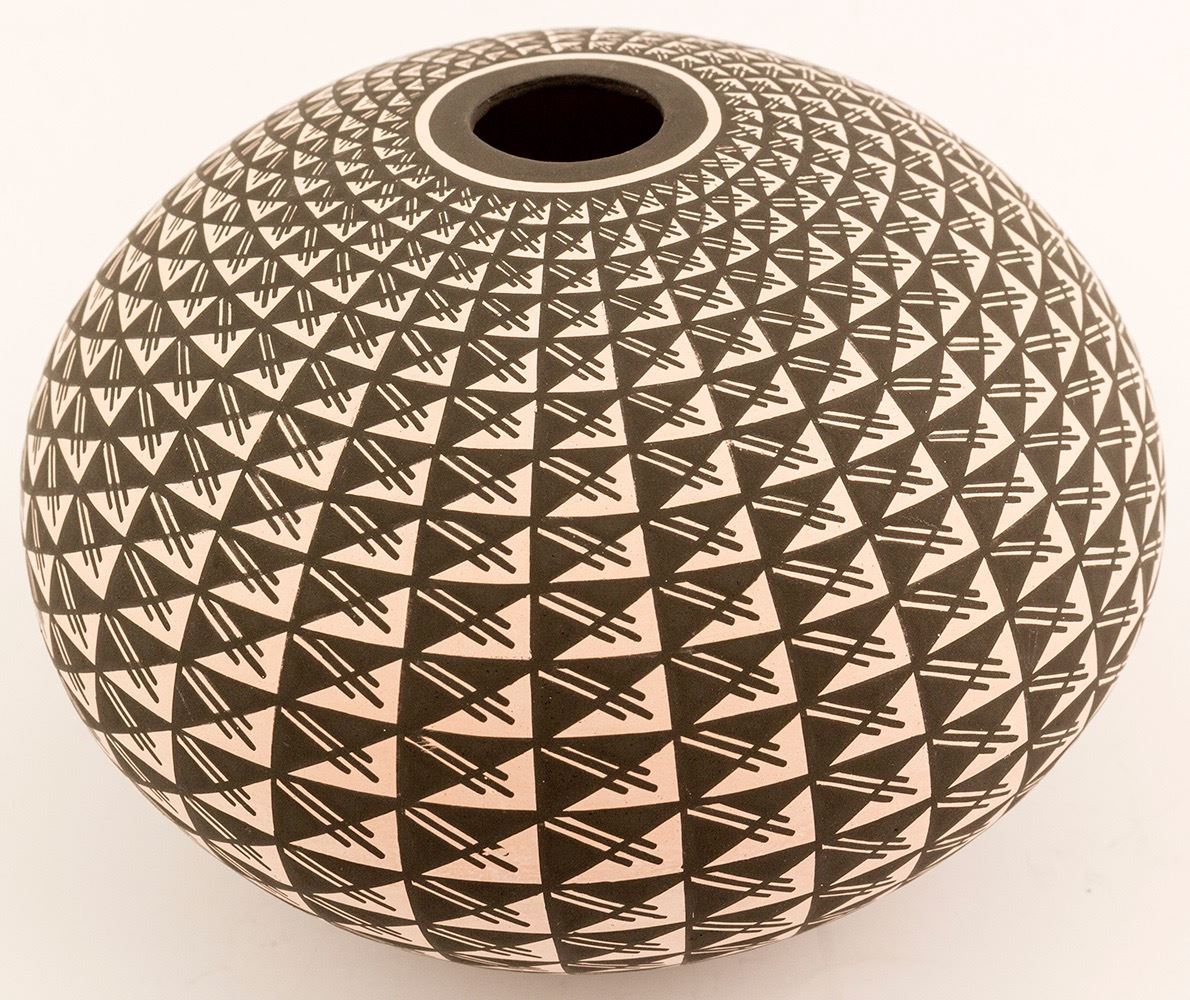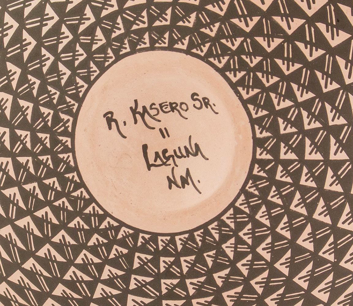 Laguna Pueblo seed pot by Robert Kasero, Sr. Very thin walled pottery with beautifully painted geometric designs. Kasero’s pottery style differs from the more open designs for which Laguna Pueblo Pottery is most often known. Robert Kasero, Sr. coil builds his pottery and paints everything by hand with yucca leaf brushes. 4.25" h x 6" diameter, excellent condition. Date: Location: Laguna Pueblo, New Mexico HWAC # 48859