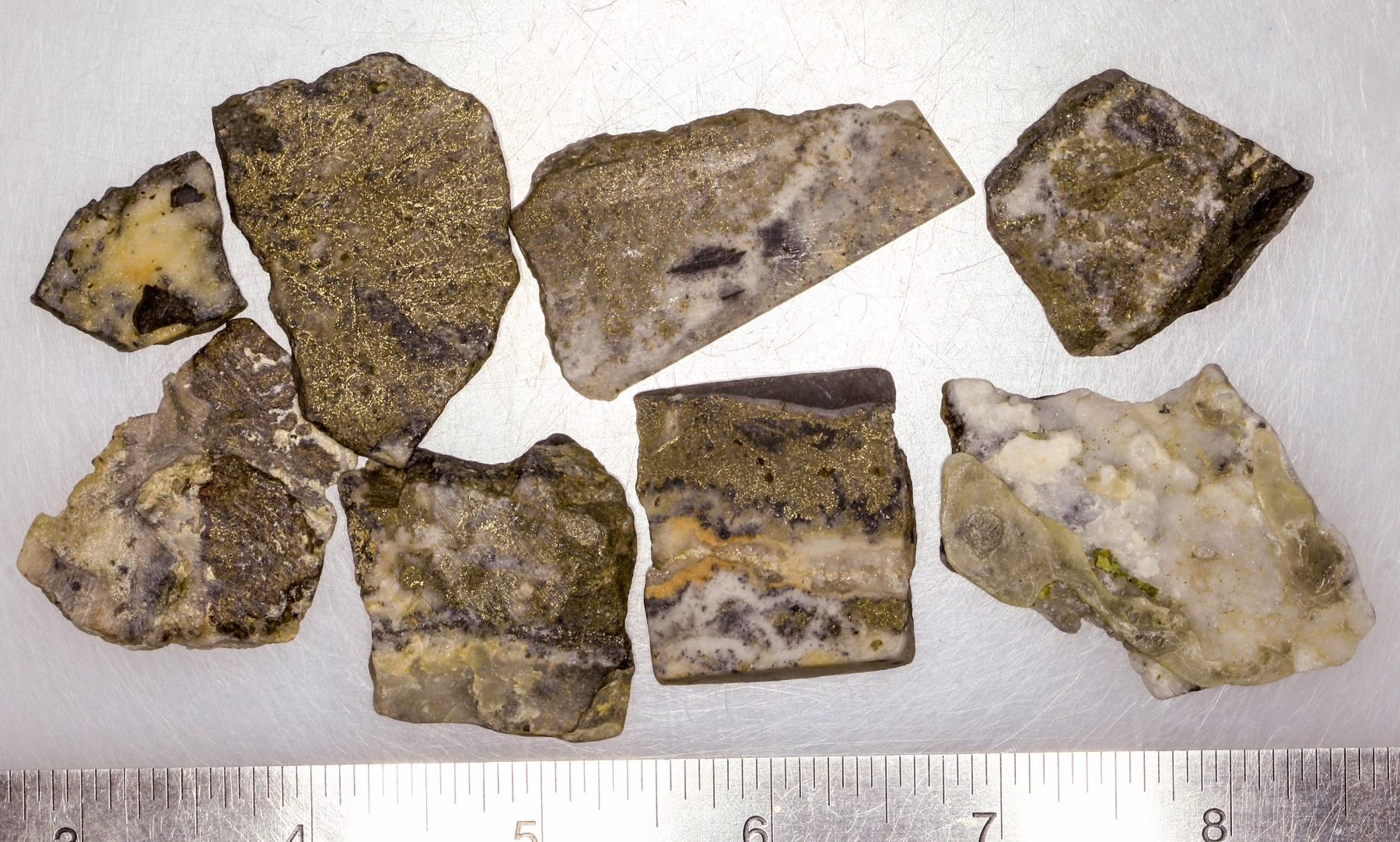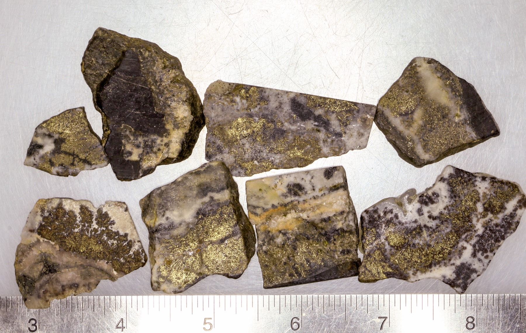 Lake County California Gold in Quartz About 8 slabs, varying size about 1 1/2" - 2" square each. Jewelry Grade. 111.4 grams. The McLaughlin deposit had some exceptionally fine gold and these slabs are an excellent example. In FH's opinion the second most attractive gold in quartz slab lot with excellent contract between white quartz and dark wall rock. Polished these should be beauties.