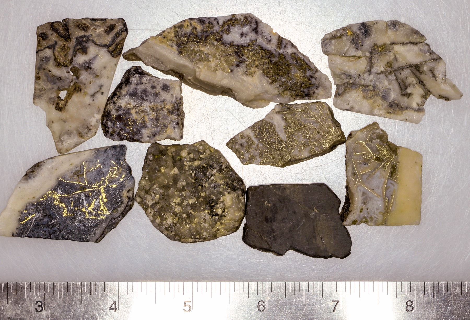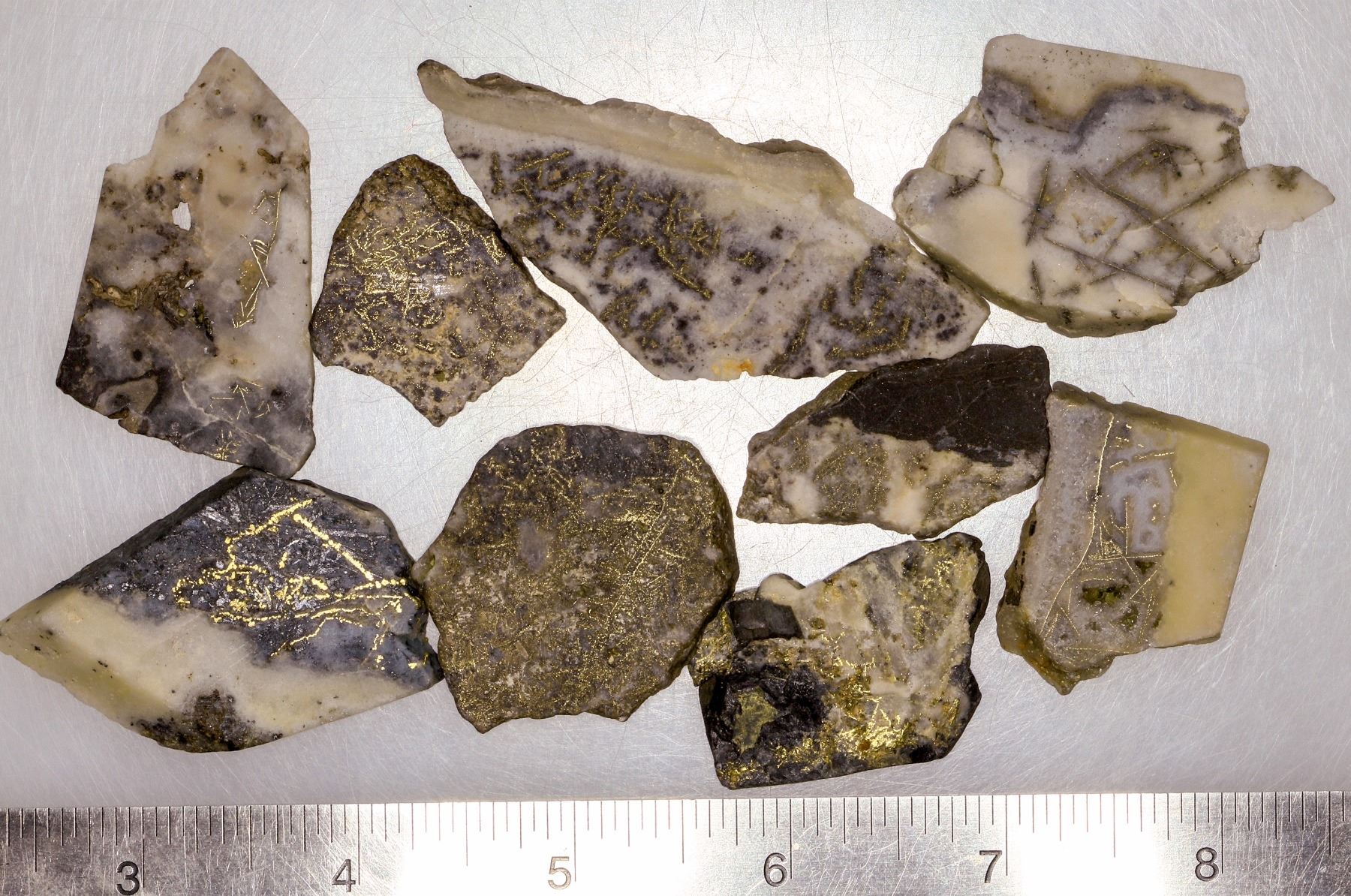 Lake County California Gold in Quartz About 7 slabs, varying size about 1 1/2" - 2" square each. Jewelry Grade. 130 grams. The McLaughlin deposit had some exceptionally very fine wire gold and these slabs are an excellent example.