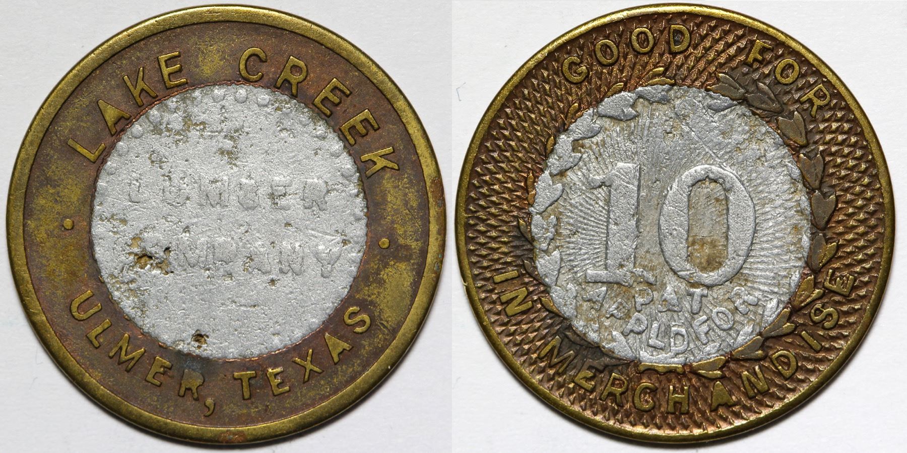 Bi-metal token GF 19 IM, from lumber company. State: Texas City: Ulme Date: HWAC# 85355