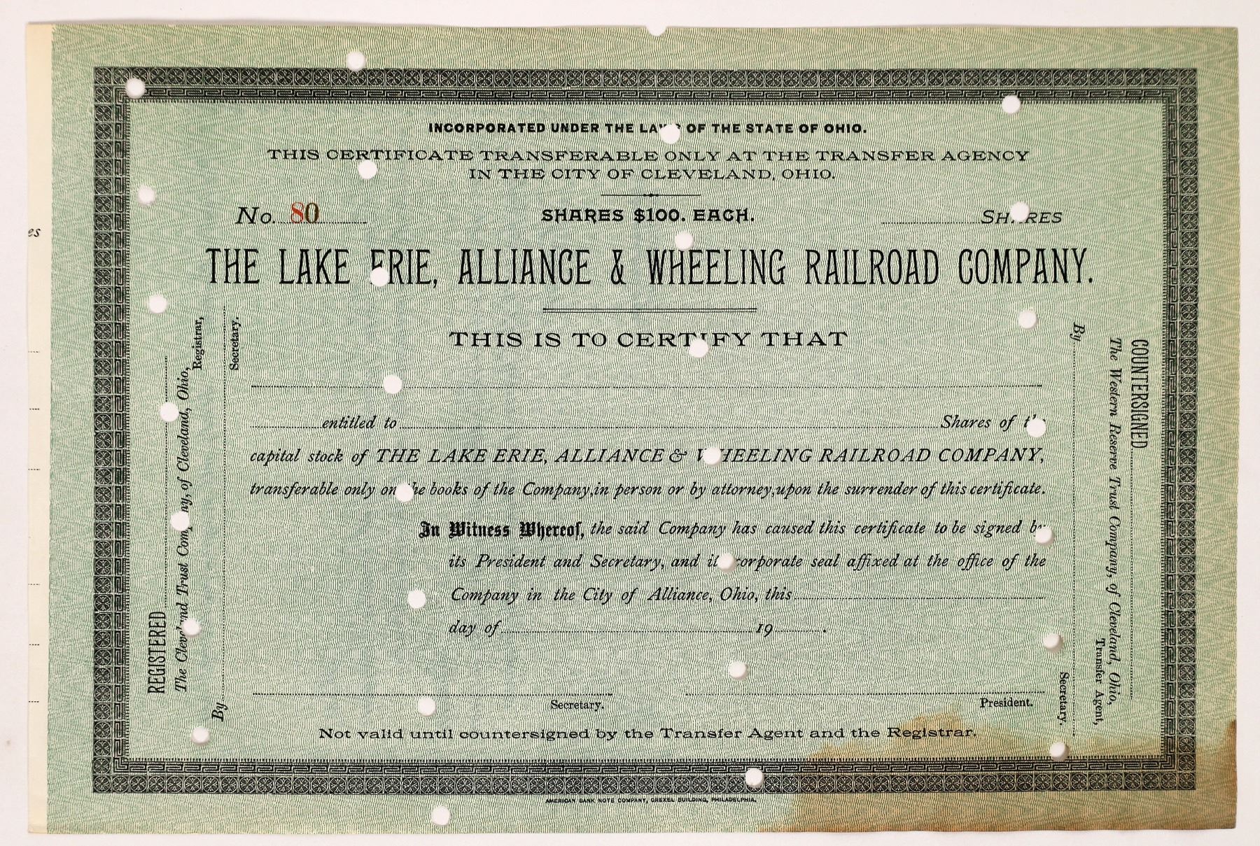 Lake Erie, Alliance & Wheeling Railroad Co, Stock, Incorp Ohio, cert #80, 19xx, 11x7", u/i, u/c, 1 cert
