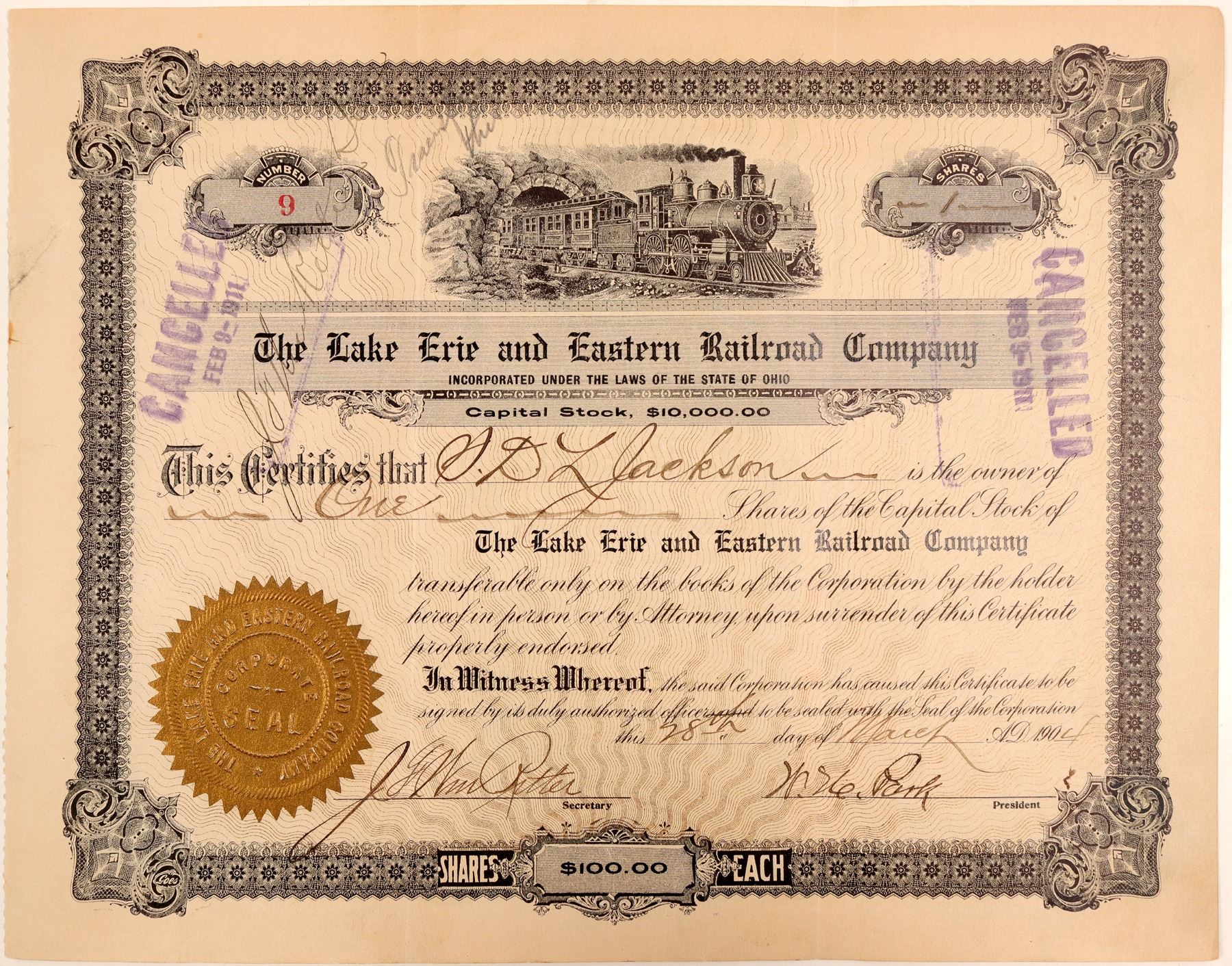 Cancelled (Feb 9, 1911 Rare 1 share of Lake Erie and Eastern Railroad Co. stock certificate # 9 at $100 each issued to S.D.L. Jackson on March 28, 1904. Signed by W. W. Park, president and J. G. Wm. Potter, Secretary. Adhesive gold seal, black border. Vignette of train coming through tunnel. Assigned by S. D. L. Jackson. Printed: Goes. Erie Railroad operated in the northeastern US, connecting Jersey City, where Erie's former terminal used to stand with Lake Erie.