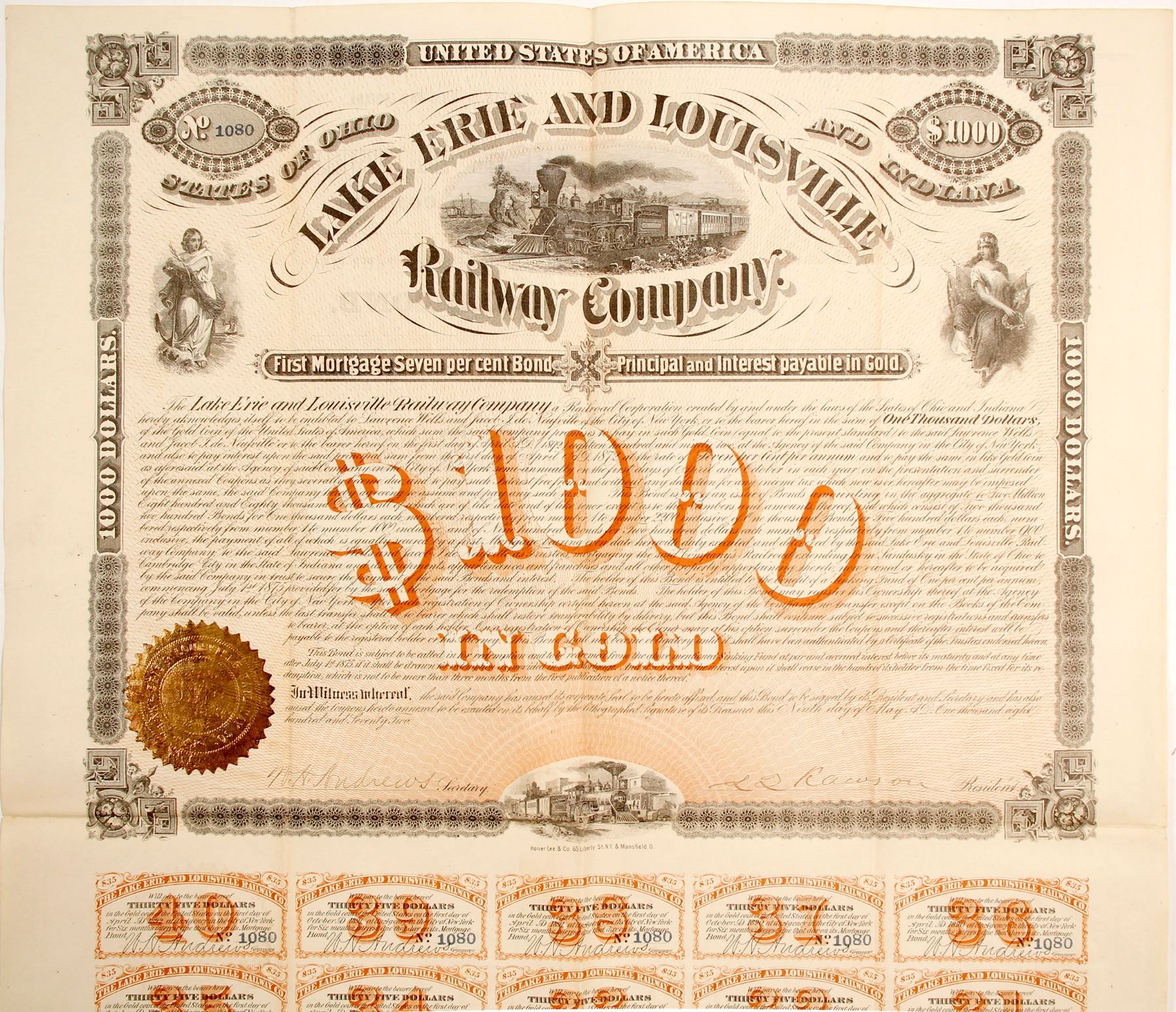 #1080 7% gold bond, orange underprint signed by Rawson. Consolidation of the Fremont, Lima, and Union and the Lake Erie and Pacific Railroads. Ken Prag Collection