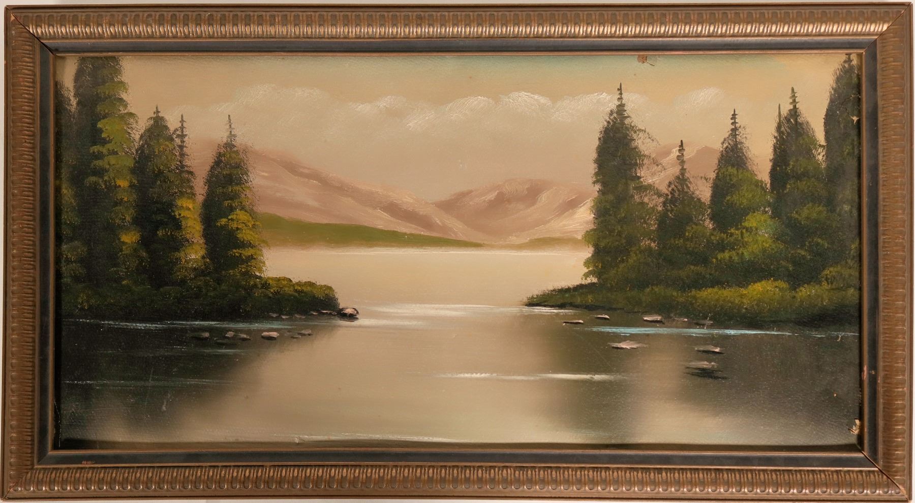 Beautiful oil painting of Lake McDonald on mat board and unsigned. Some damage on edges, but could be matted and reframed. Painting:12" x 24". Framed: 14.5" x 26.5". Area written on back in pencil.