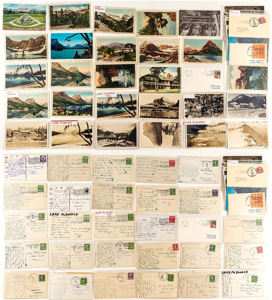 38 total postcards. Nine RPC's, including a great card of a mountain goat, a lake view of the lodge and a view of the lake with glaciers on it. Three different postmarks. Three postal cards included. Most of the cards are hand-colored. Glacier National Park. (Svoboda Collection) City: Lake McDonald State: Montana Date: c-1920's-1950's HWAC# 35563