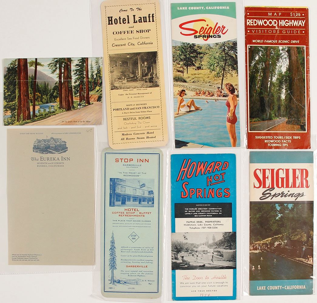 Lot of 9. Includes: accordion postcard booklet for the Redwood Highway, California; advertising card for Hotel Lauff in Crescent City; two copies of a 1950s brochure for Seigler Springs in Lake County; 1950s brochure for Howard Hot Springs in Lake County; advertising card for the Stop Inn in Garberville, California; 1980s color map of the Redwood Highway; different Seigler Springs brochure; and an unused stationery for the Eureka Inn. HWAC# 60007 Date: Location: California