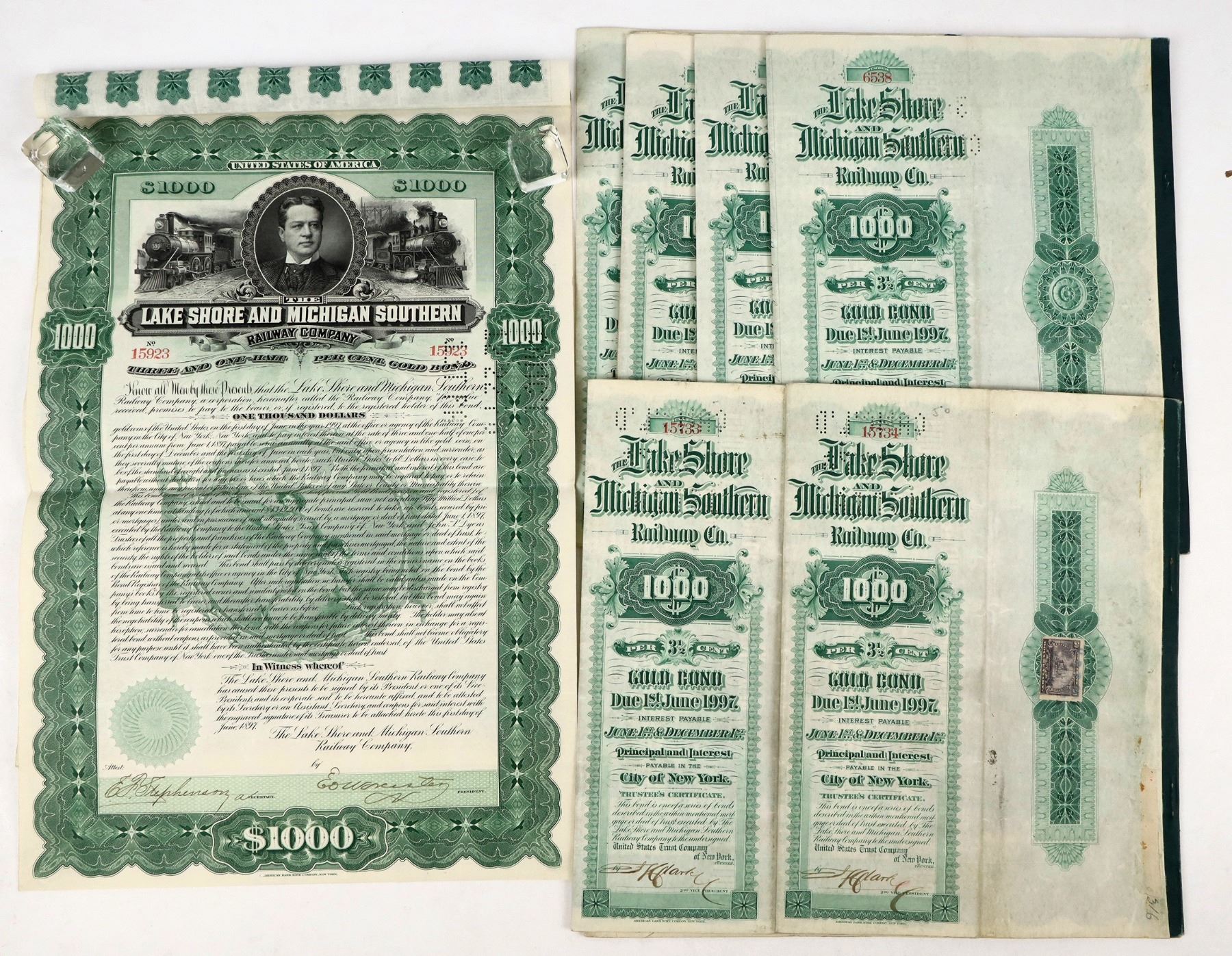 There are nine gold bonds in tis lot for the Lake Shore & Michigan Southern Railway Co. issues in 1897. Please see photo for details.