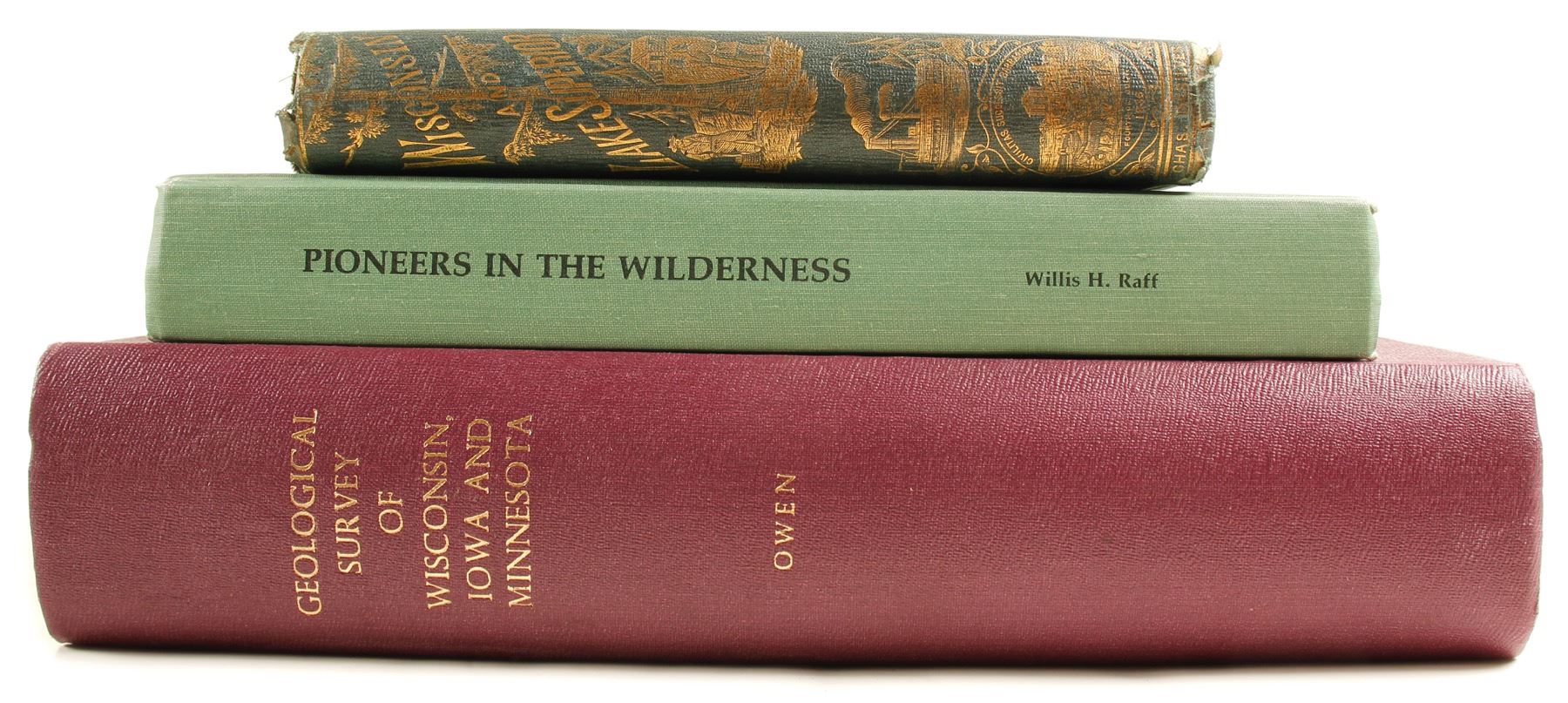 Important reference works on the Lake Superior Region. Three volumes. Wisconsin and its Resources with Lake Superior, it’s Commerce and Navigation by James Ritchey. Charles de Silver, Philadelphia, 1857 map inside front cover torn and incomplete. Key early reference on the history of this region. Second volume is a report of the Geologic Survey of Wisconsin, Iowa and Minnesota by David, 638 pages, indexed, 1852. Published by Lippincott Philadelphia. Highly illustrated. A choice key reference, rebound. The third reference is Pioneers in the Wilderness by Raff, 1981. State: City: Date: