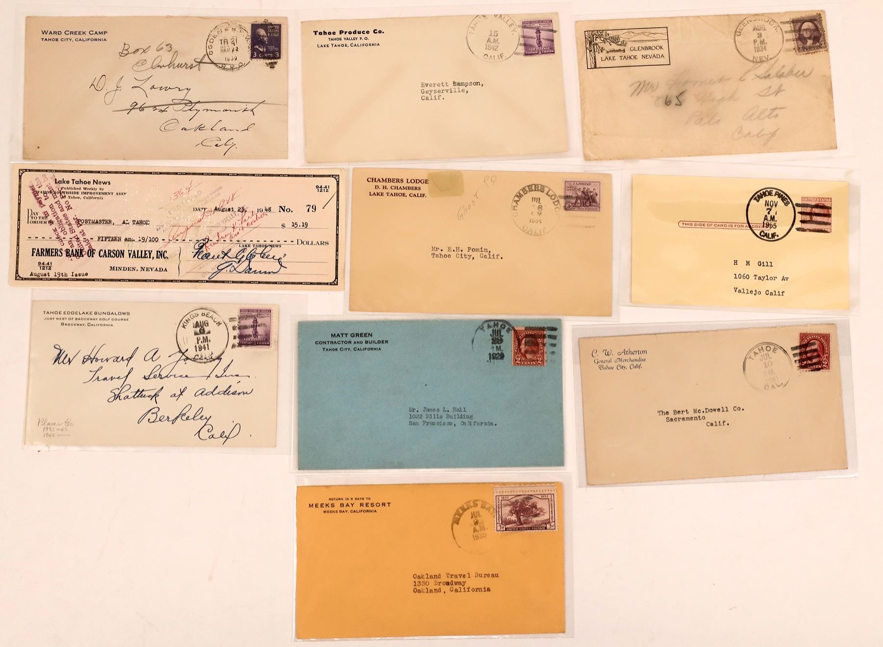 Lot of 10 different. This is a great group of different Tahoe area cancels. Includes 8 corner advertising covers: Glenbrook (1934, steamer vignette); CW Atherton Gen Mdse Tahoe City (1931); Meeks Bay Resort (1935); Matt Green Contractor Tahoe City (1929); Chambers Lodge (1934); Tahoe Produce Co., Tahoe Valley (1942); Tahoe Edgelake Bungalows (Brockway) (1941); Ward Creek Camp, Tahoe City (1939); a postal card with Tahoe Pines cancel (1955); and a rare Lake Tahoe News (newspaper) check from 1948.