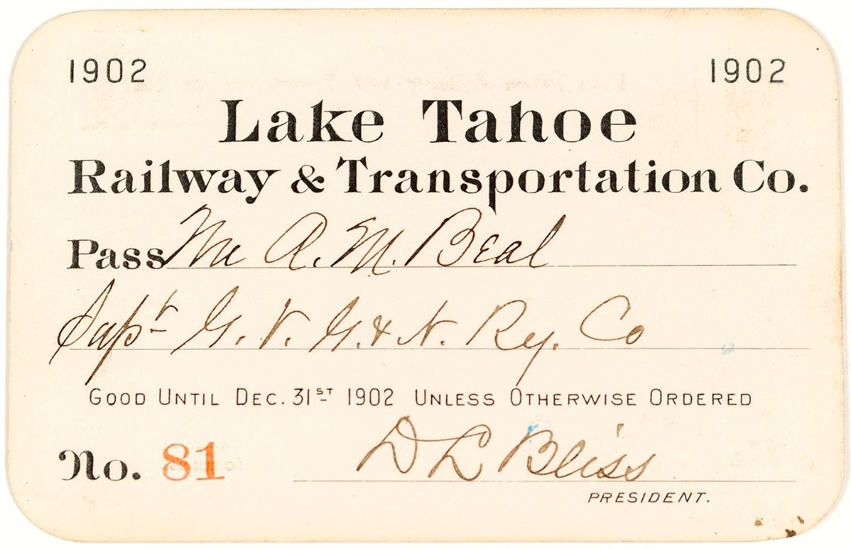 Very early pass for this railroad! No. 81, issued to A.M. Beal (superintendent of Gila Valley, Globe and Northern Railway) for 1902. Signed by D.L. Bliss as president. Printed on cardstock with light toning and soiling. D.L. Bliss made his fortune by supplying lumber to the mines on the Comstock Lode. His operations at Lake Tahoe included the Carson & Tahoe Lumber & Fluming Company. With the decline in mining in Virginia City in the 1880s and 90s, Bliss realized that his lumber operations would become obsolete. With great foresight, he predicted that Lake Tahoe would become a world-renowned tourist attraction. Pulling up his rail lines on the east side of the lake and buying a small fleet of steamers, Bliss formed the Lake Tahoe Railway & Transportation Company. Inc. in 1898, the rail opened May 1900. The 16-mile track ran from Truckee to the wharf at Tahoe City where passengers could get off the train and get right on one of the steamers owned by the company and tour the lake. Later, the Bliss family built the Tahoe Tavern as the last piece to this tourism experience. After Bliss died in 1907, his sons took over the enterprise. The line was leased by Southern Pacific in 1925, bought outright in 1933 and abandoned in 1943. (Prag Collection) City: Lake Tahoe State: California, Date: Inventory# 39247