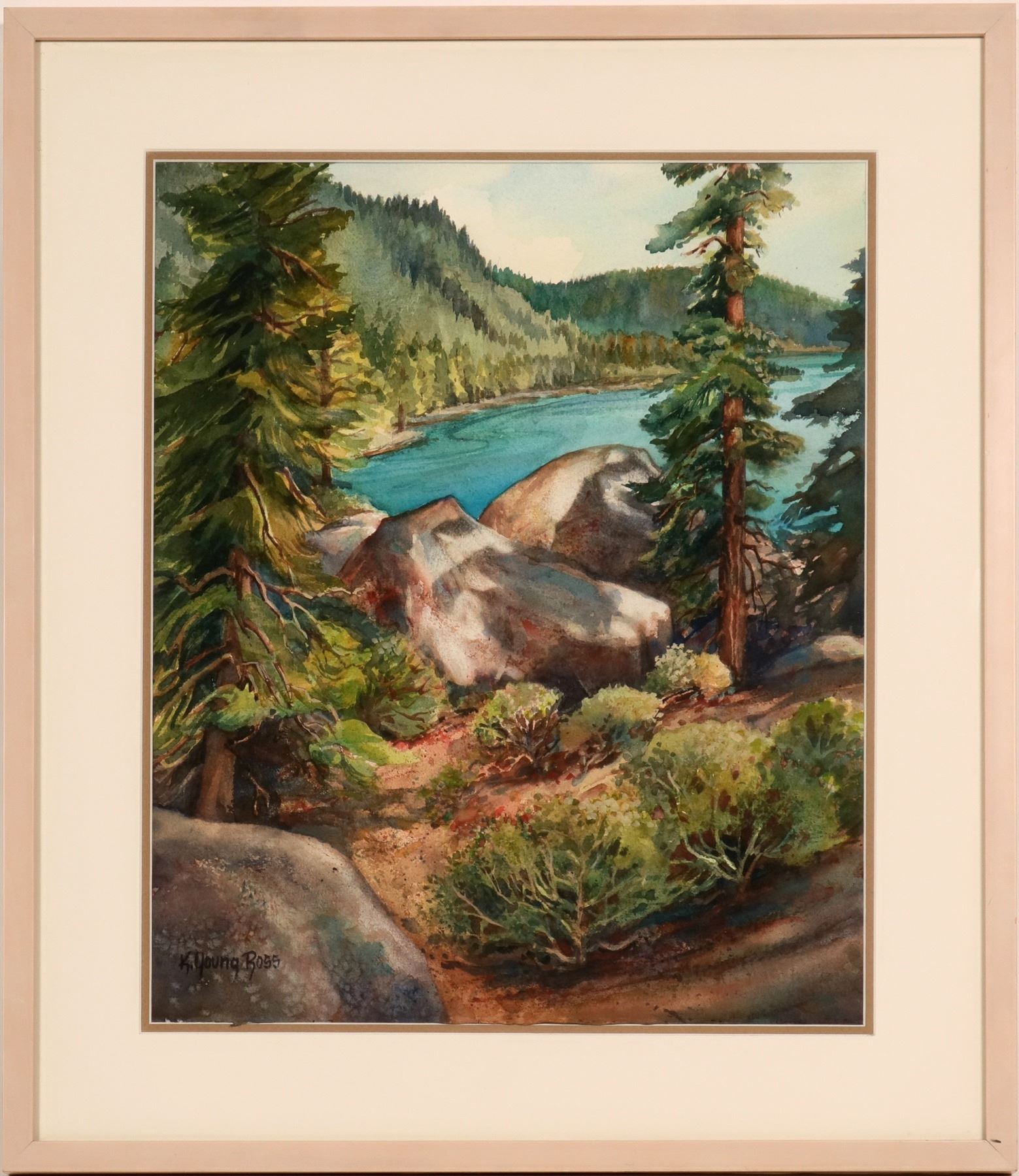 Great east shore of Lake Tahoe watercolor. Painter, Kathy Young Ross, from Gold River, California began painting as a commercial artist. She later taught painting and did her own works in watercolor and acrylic. This colorful landscape painting is nice depiction of Tahoe. Framed size: 29" x 25".
