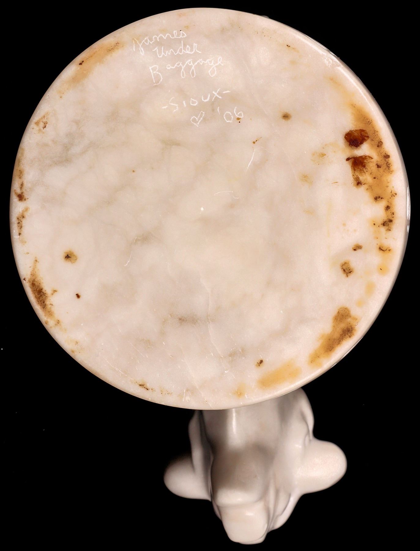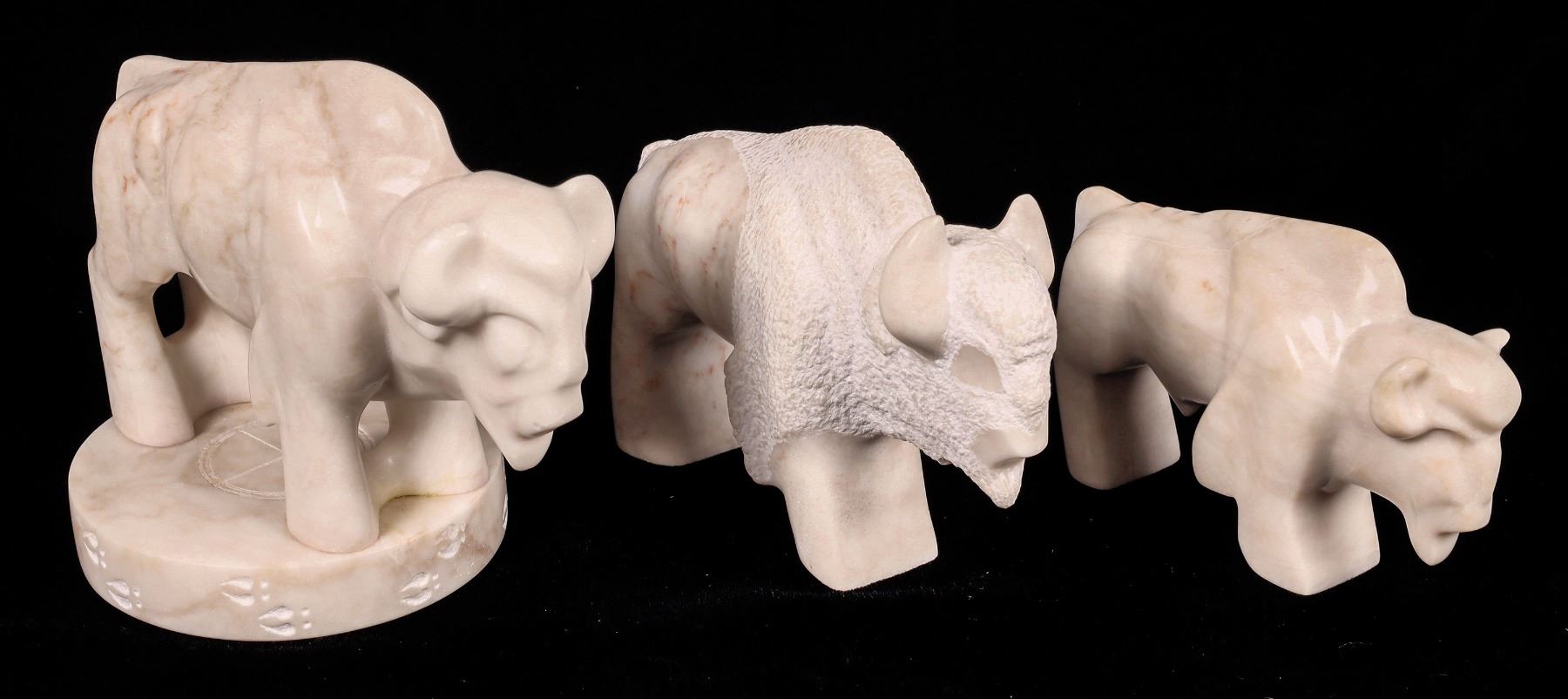 These are three carved buffaloes of white alabaster; all are craved by James Under Baggage, Oglala Sioux; all are signed and dated '05-'06; 5 in.-7in. The largest buffalo has a base giving sign to four directions and hoof prints around the circumference. All tastefully done.