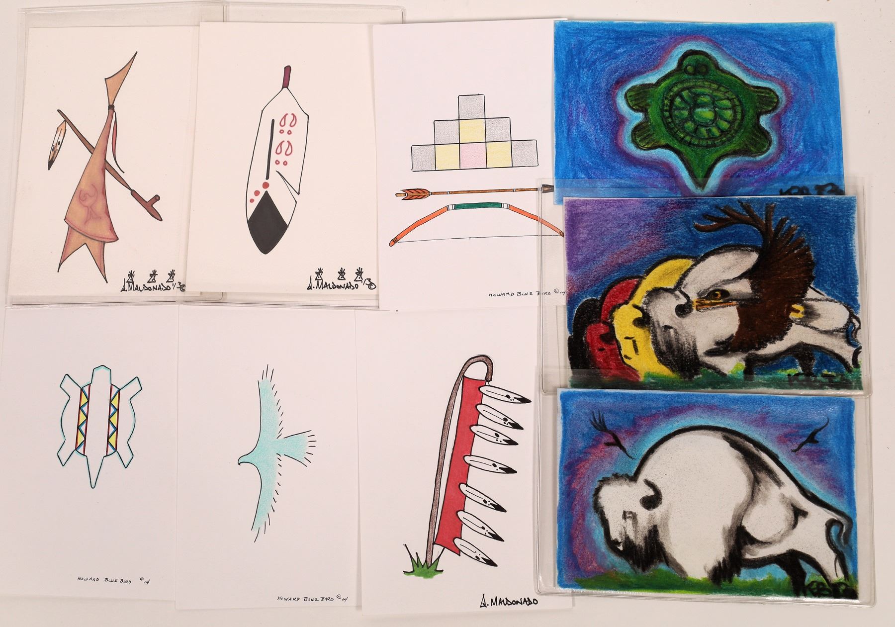 Original Art Cards from 3 different Prominent Native American Lakota Artists, Quinton Maldonado, Howard Blue Bird and Kevin Poor Bear. This is a nice collection of original art from 3 talented, respected and collected artists, whose artistic styles are well-known and uniquely reflect their Native American heritage and Lakota roots. Cards measure approximately 4 x 6 inches, and all are protected in sleeves in excellent condition.