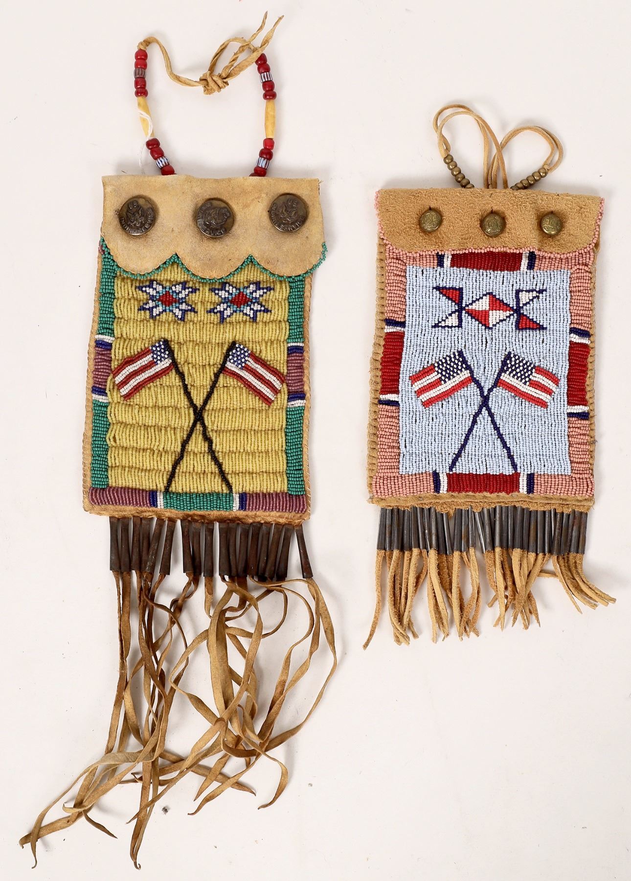 Indian medicine bags (2). While both measure about the same 5"x 7", one appears to be much older than the other, having appeared to have been brain tanned in its early life. Both are intricately beaded and there are brass buttons on both, referring to the U.S. Indian Service, part of the Bureau of Indian Affairs, who were charged with improving relations and trust with the various tribes.