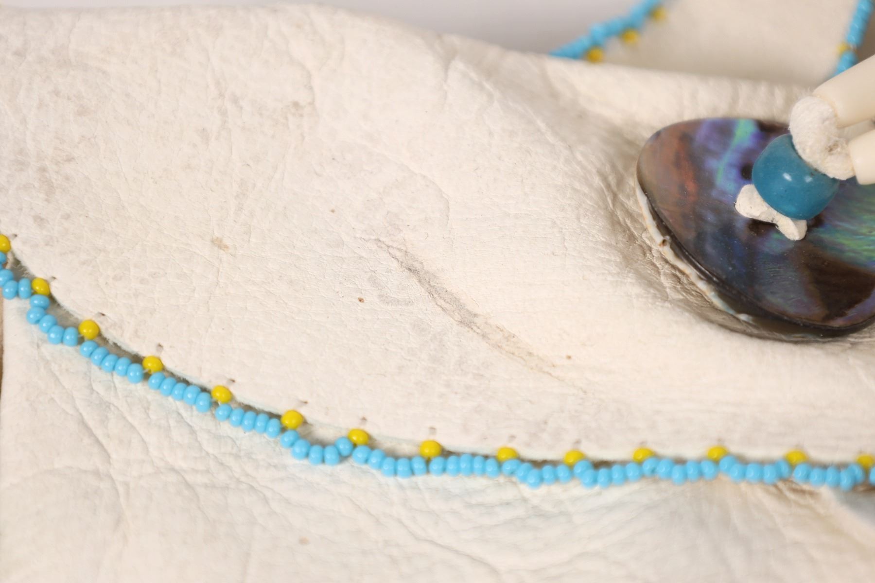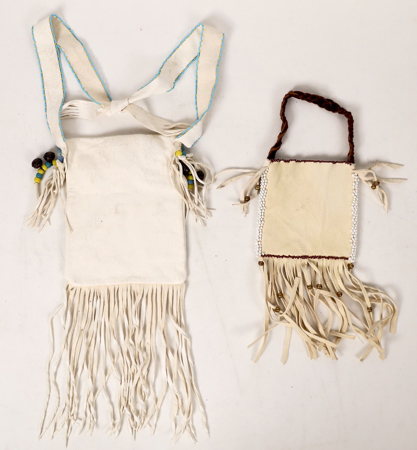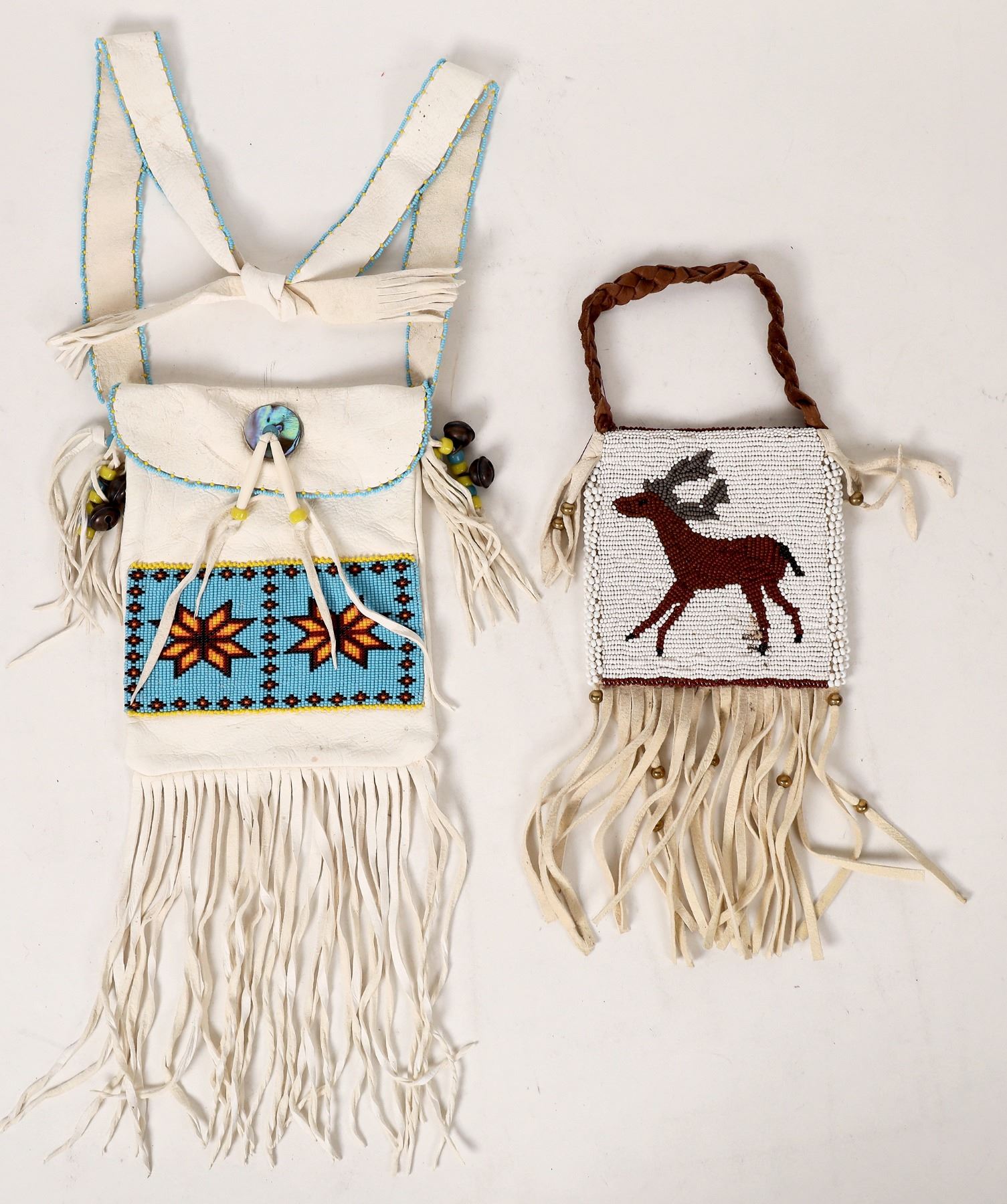 Medicine bag duo (2), intricately beaded. One is credited to Jerrilyn Elk, Oglala Lakota from Wounded Knee, SD. The other maker is unknown. One measures 5"x 5" and has a deer bead design, the other measures 6"x 8", comes with attached shoulder strap and is decorated with seed bead flowers. This is the one credited to Jerrilyn Elk. These are in nice condition. Please see photos for more detail.