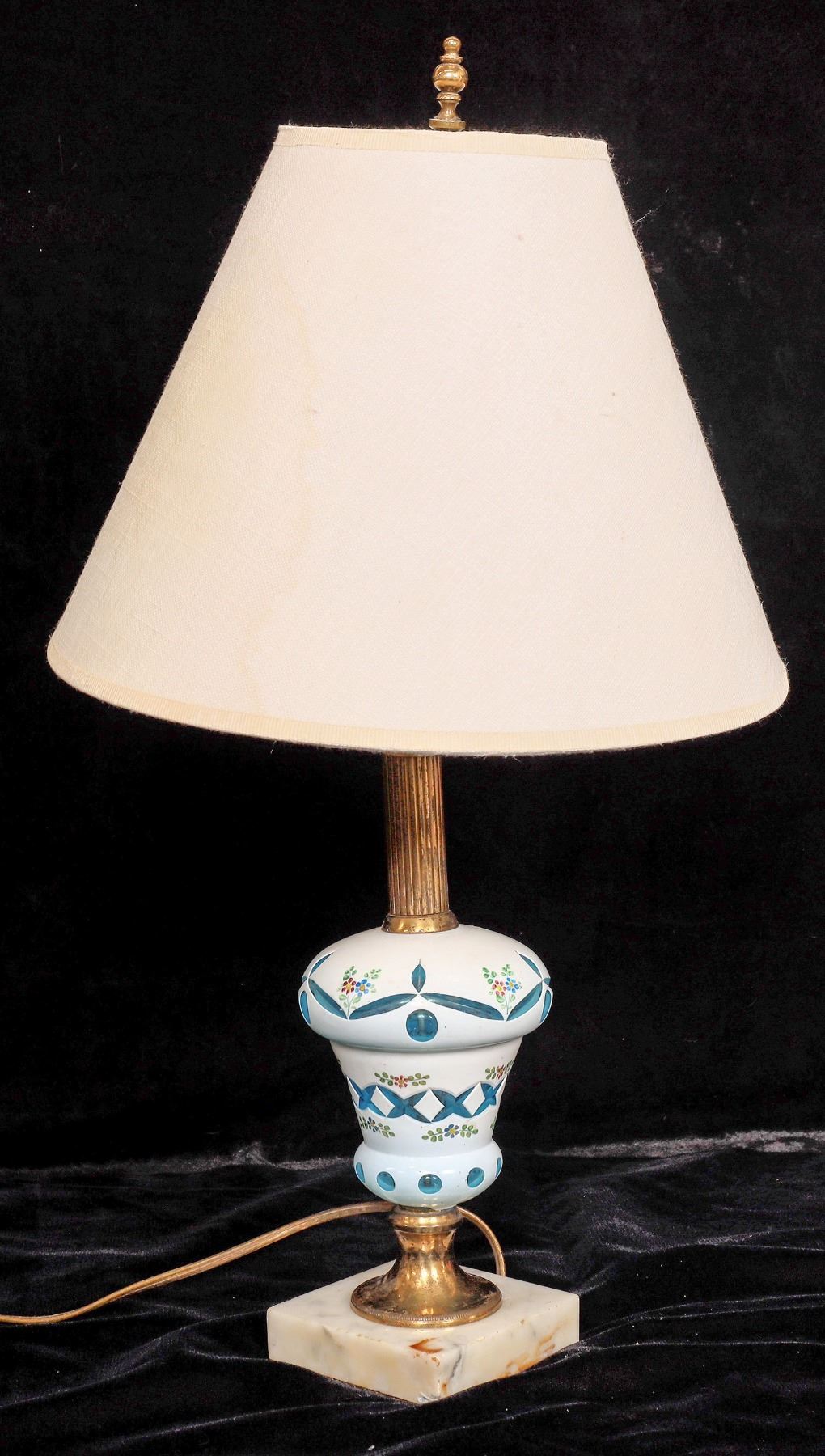 Antique electric lamp on marble base. Light blue and floral pattern on body. 21" tall with shade. Some brown residue on base.