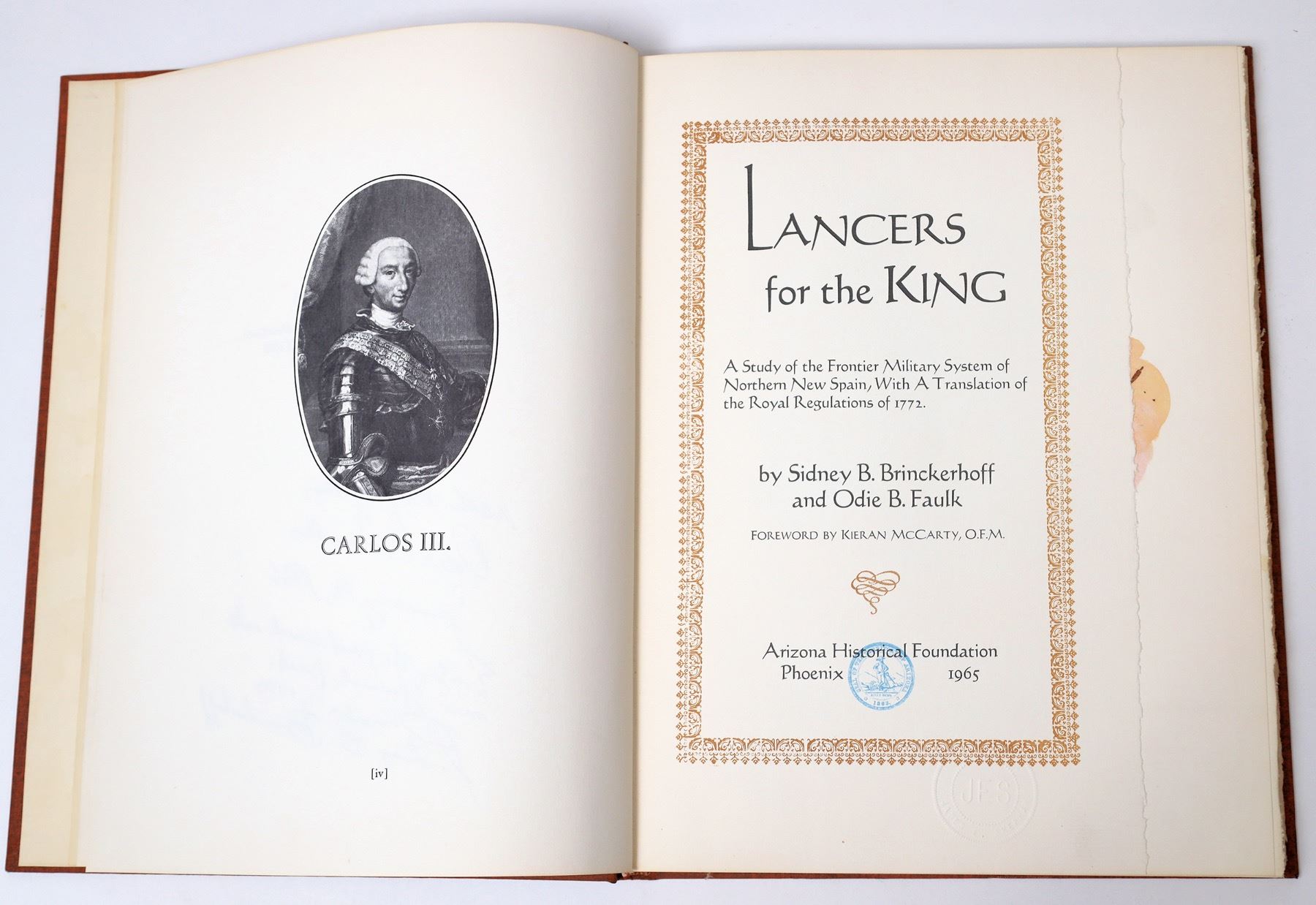 Lancers for the King: A Study of the Frontier Military System of Northern New Spain, With a Translation of the Royal Regulations of 1772 by Sidney B. Brinckerhoff and Odie B. Faulk. Foreword by Kieran McCarty. Published by the Arizona Historical Foundation in 1965. Signed by the authors. 128 pages. 9.75 x 12.75 inches. Good condition.