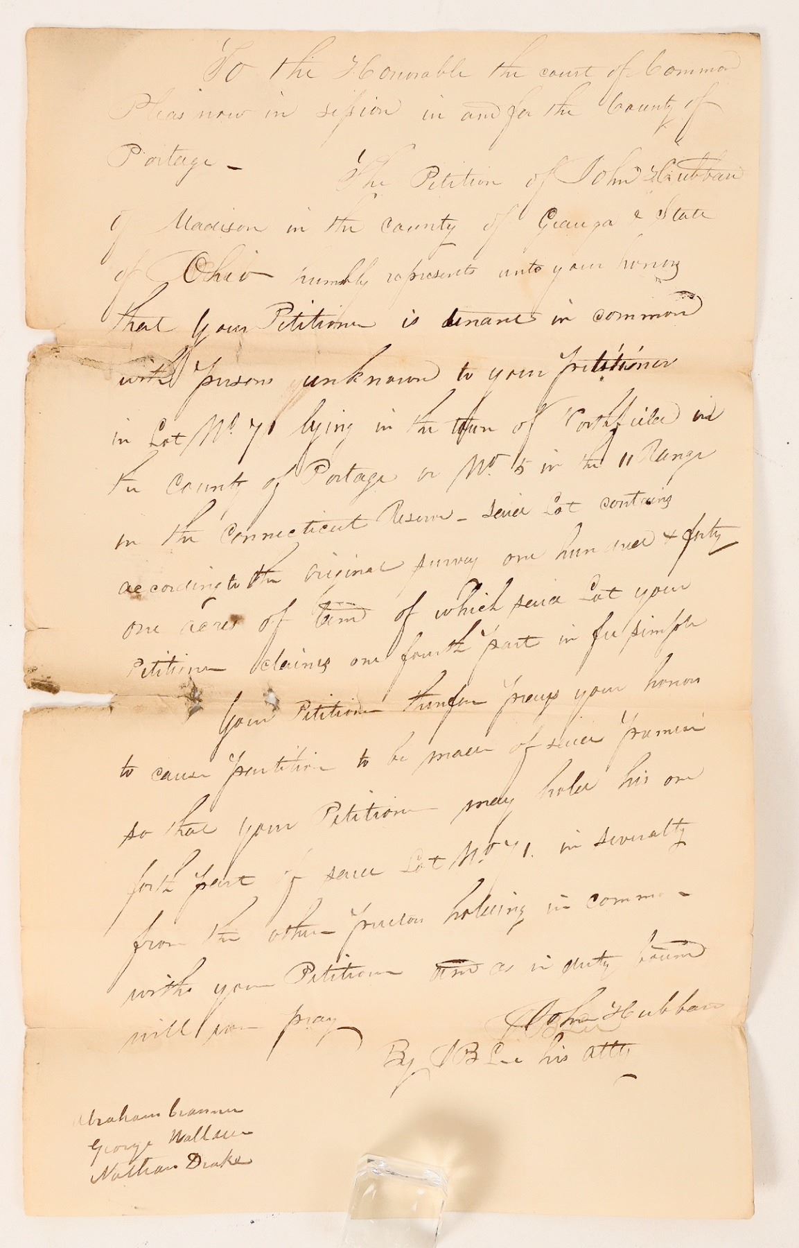 A handwritten 1820 document from the Court of Common Pleas of Portage County, Ohio regarding a dispute over the land claim of Mr. John Hubbard, a citizen of Geauga County. Signed by both Hubbard and his attorney, J. B. Lee. His claim is over a piece of land in the Connecticut Reserve.[ Ohio