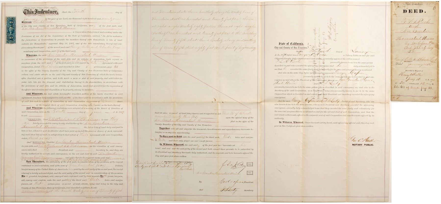 Land Deed Issued to Francois Pioche in San Francisco January 10, 1871. Signed f. .l. a Pioche. Pioche was a French born bon vivant San Francisco banker and financier. Parisian born in 1818, suave and cultured Francois Pioche was Secretary to the French Consul in Santiago, Chile, when he decided to join the Gold Rush to San Francisco in 1848 with Julius Bayerque. Once here, they became importers of wine and by the mid-1850s, they had established a reputable mercantile and banking house on the north side at 744 Montgomery Street, just off Portsmouth Square. In 1851, he went to Paris to boost San Francisco and its future. Coming back with about six million francs to invest, he proceeded to channel the money into many successful enterprises, becoming one of primary builders of San Francisco. (Courtesy www.piochenevada.com.) Four page legal document of California history. Sound condition. City: San Francisco State: California Date: 1871