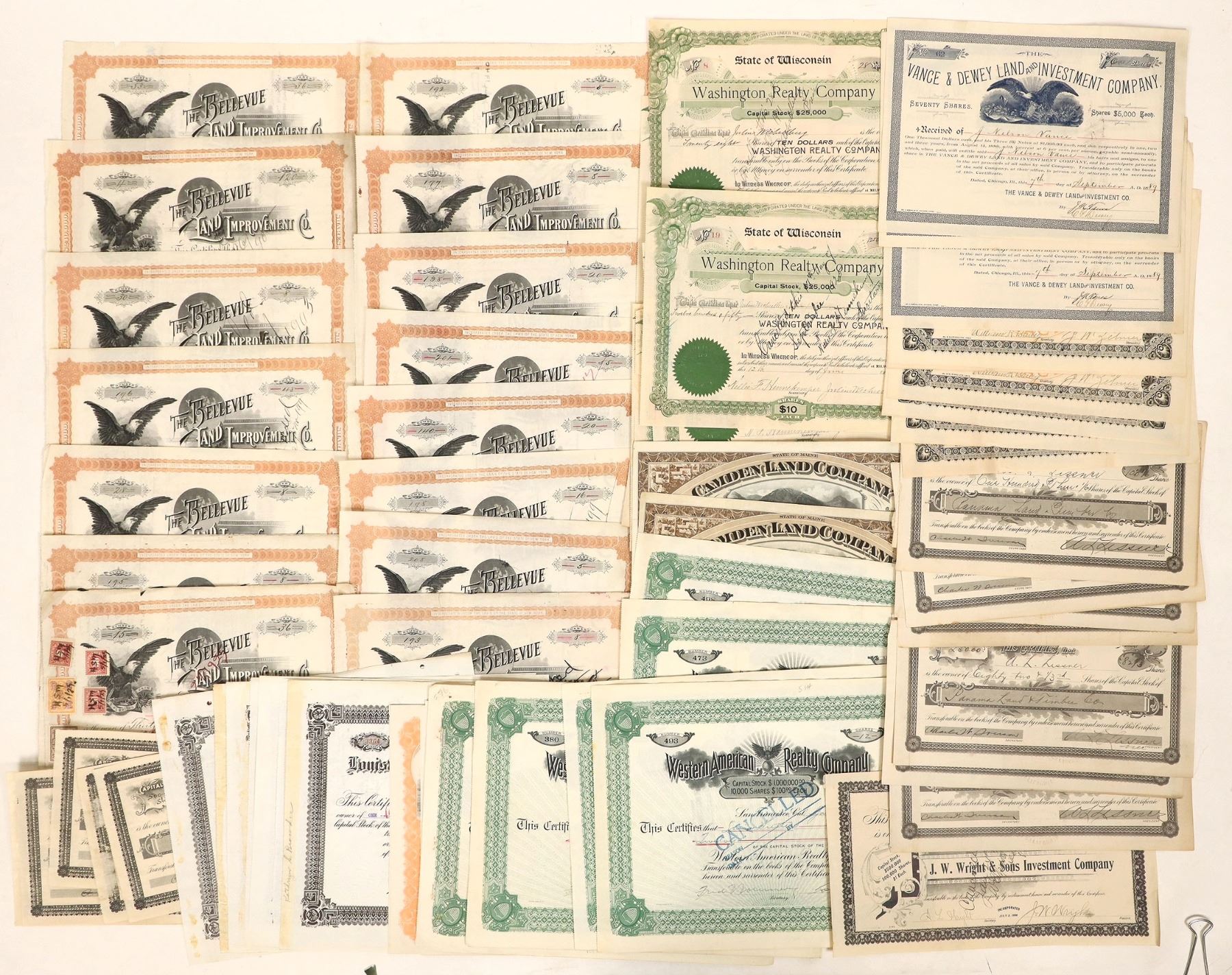 5x 1907-11 J W Right and Sons Investment, 16x 1890's Bellevue Land Improvement, 7x 1946-47 Louisville Property, 6x 1911 Buckhorn Ranch, 6x 1917-25 Western American Realty, 7x 1892 Enterprise Land Windfall Indiana, 8x Panama Land Timber plus others with some dupes.