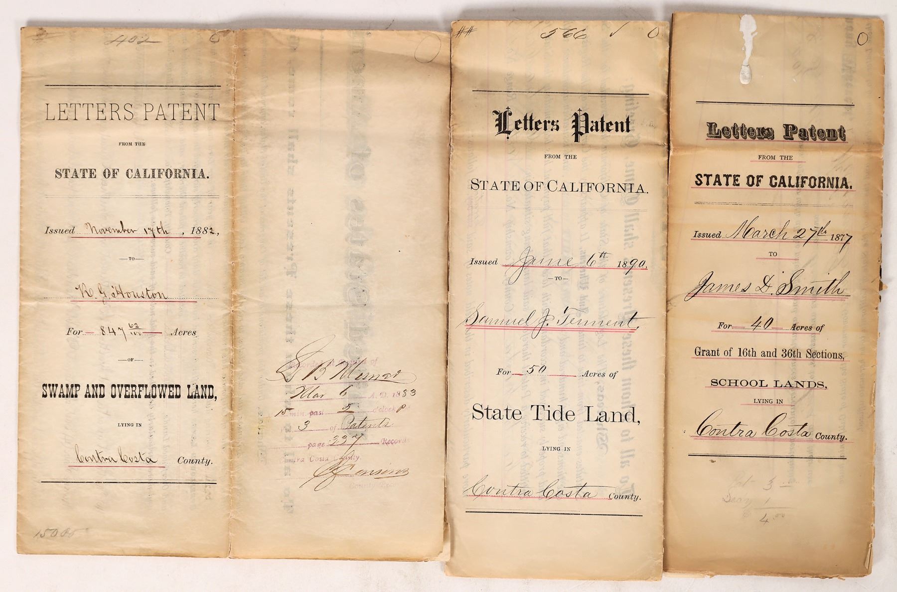 Land patents (3) all signed by the governors at the time, Included is a 40 acre parcel intended for a school. It's dated March 27, 1877 and signed by Governor William Irwin. Next is a patent for 847 acres for swamp and overflow lands and dated November 17, 1882 and signed by Governor George Stoneman. Finally, a patent for 50 acres of state tide lands, dated June 6, 1890 and signed by Governor Robert Waterman. These are in fold fragile condition, but very readable. Please see photos for more details. Contra Costa County California