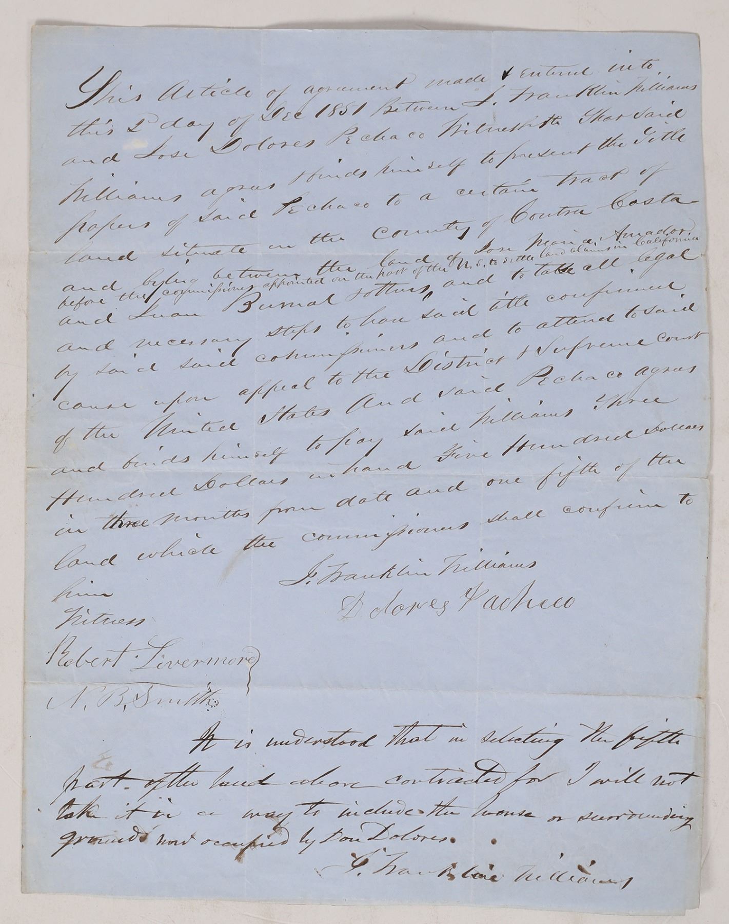 This is a contract that calls for Don Jose Dolores Pacheco to Franklin Williams for the sum of $3000, plus a deferred payment of $500. The contract is signed by not only the principale Pacheco and Williams, but by Robert Livermore (Also known as Don Roberto Livermore) the person after who the city of Livermore is named for. Condition is very readable. Another slice of California history. Please see photos for more details. Contra Costa County California