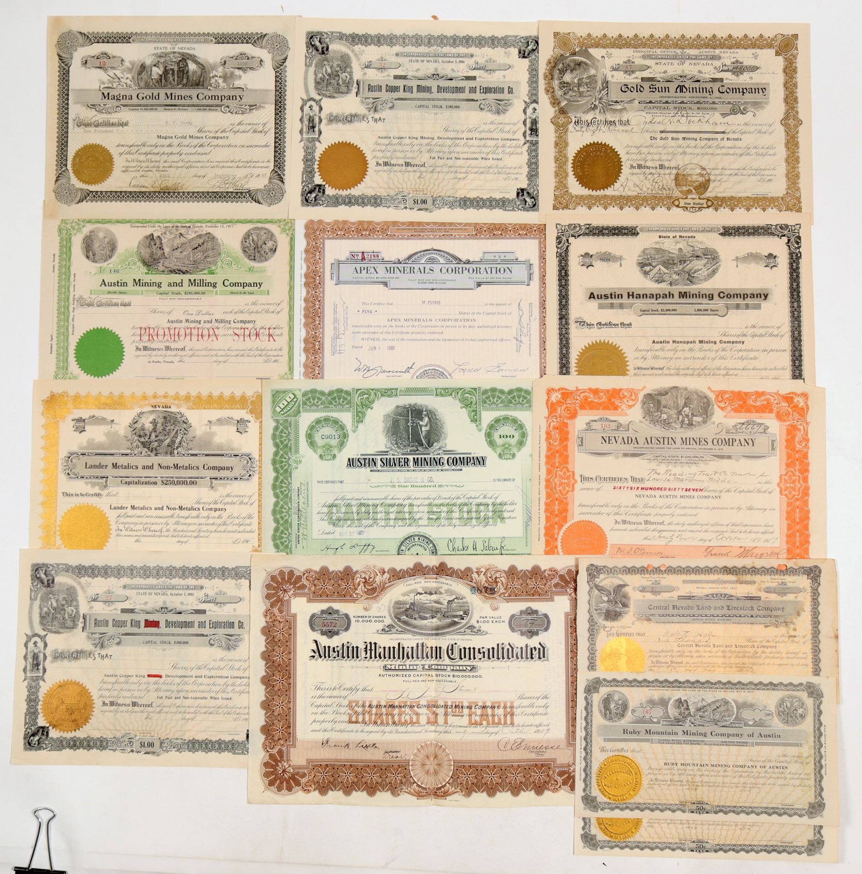 Lot of 14. Most have mining vignettes. Includes: Austin Manhattan Cons. Mining Company (1909, not cxl); Nevada Austin Mines Company (1917, not cxl); Gold Sun Mining Company (partially issued, princ. office in Austin); Austin Copper King Development & Exploration Co. (two unissued); Ruby Mountain Mining Company of Austin (two unissued); Magna Gold Mines Company (1927, not cxl); Central Nevada Land & Livestock Co. (Austin, 1911, punch cxl); Austin Silver Mining Co. (1937, not cxl); Lander Metalics and Non-Metalics Co. (unissued); Austin Hanapah Mining Co. (unissued but corp. signatures); Austin Mining and Milling Co. (unissued); and Apex Minerals Corporation (1961, not cxl). Please inspect. Ken Prag Collection