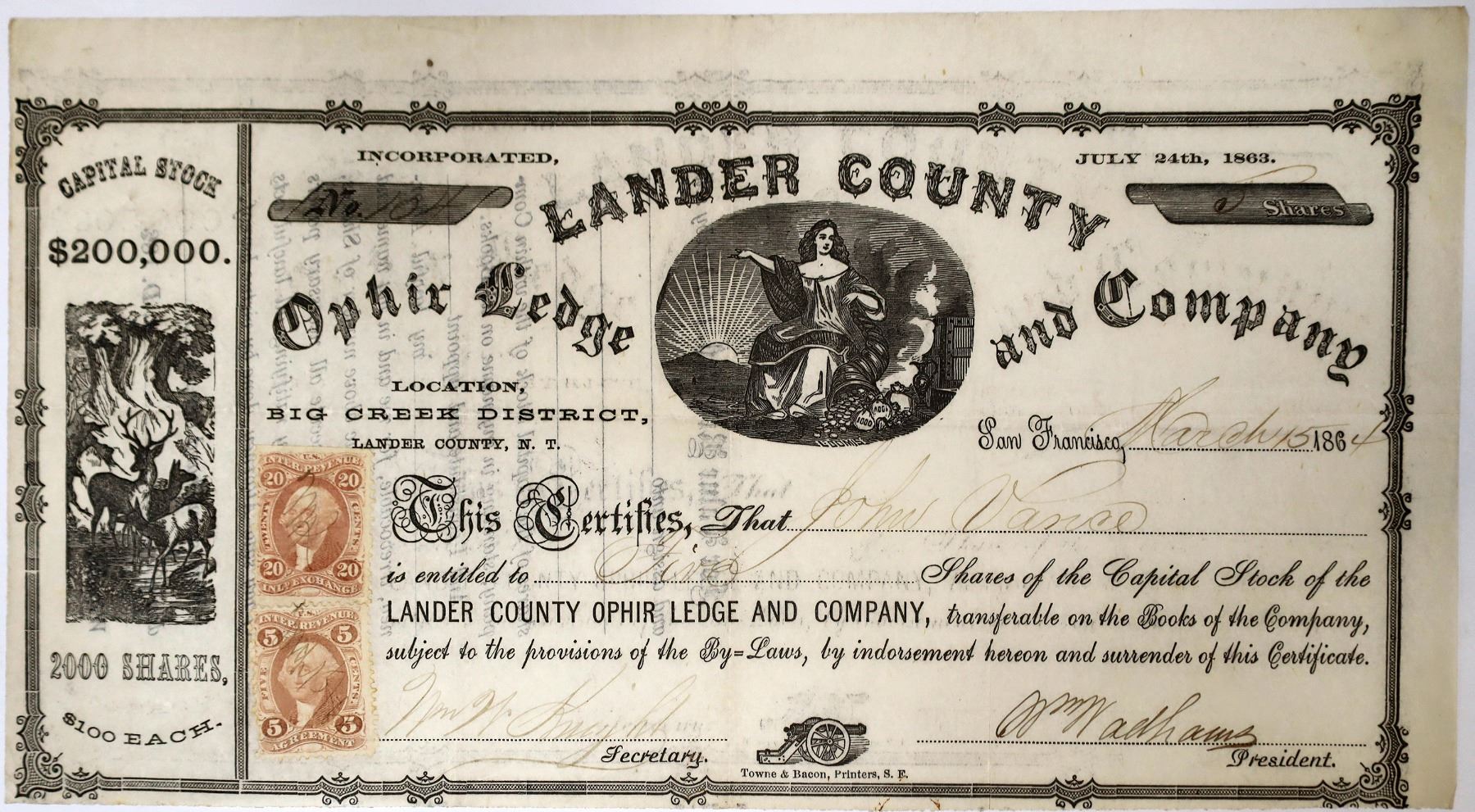 # 104 for 5 shares to John Vance. Signed by William Knight and president William Madhaus. Dateline San Francisco March 15, 1864. Incorporated July 24, 1863. Small 5c and 20c revenue stamps. Not cancelled. Deer vignette on left. Allegorical vignette with horn of plenty in center. Loomis vignette Towne & Bacon printer. Cut unevenly. Very minor edge and corner flaws. Very nice! An assessment of 15c per share levied in August of 1863. Company also known as the Lander County Ophir Ledge Gold and Silver Mining Company. A few notes on the company and Loomis - a San Francisco favorite lithographer at this time.