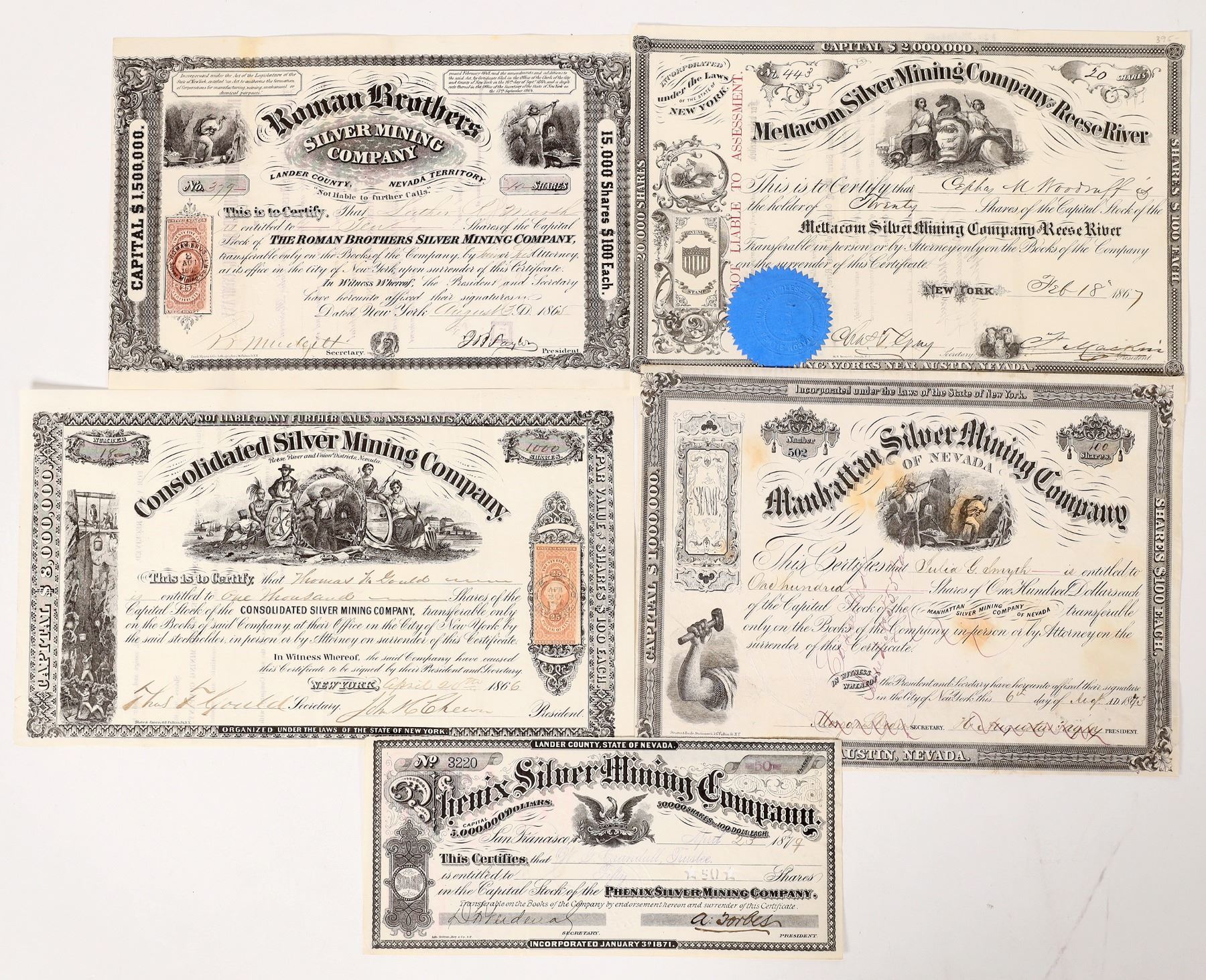 1. Roman Brothers Silver Mining Company, inc. 1864 in New York; located Lander County, NV. Cert. no. 379 issued for 10 shares at $100 each to Luther Marsh on Aug 3, 1865. Signed by president James B. Taylor and secretary Benjamin F. Mudgett. Not Cancelled. 2 different underground mining vignettes, ornate black border and print by Ferd. Mayer & Co., NY.