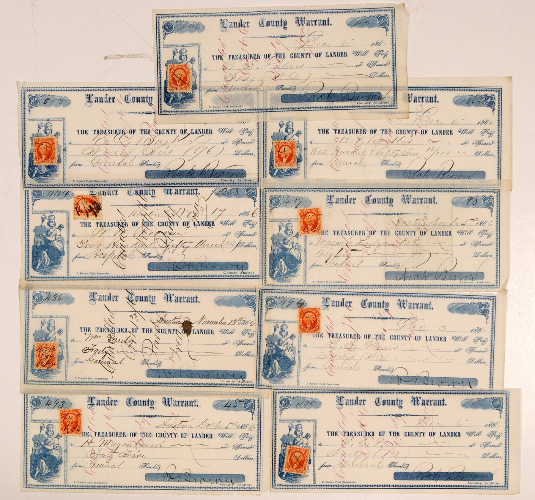 8 1866 Lander County Warrants with bank stamps. Datelined Austin