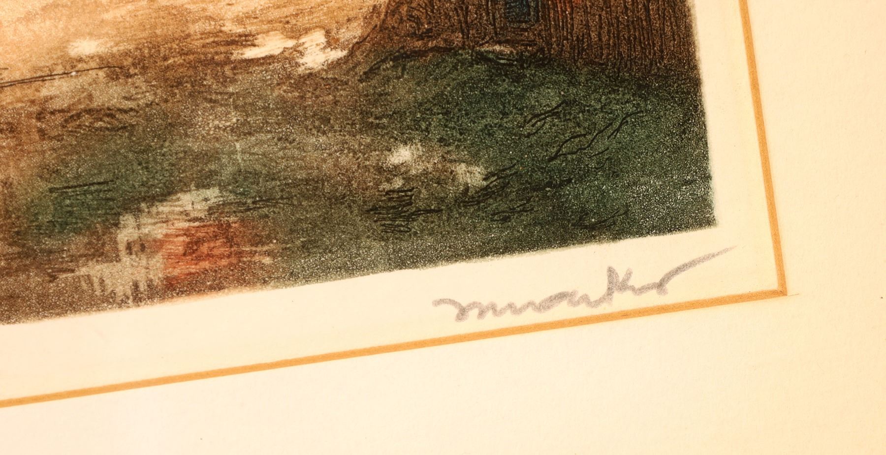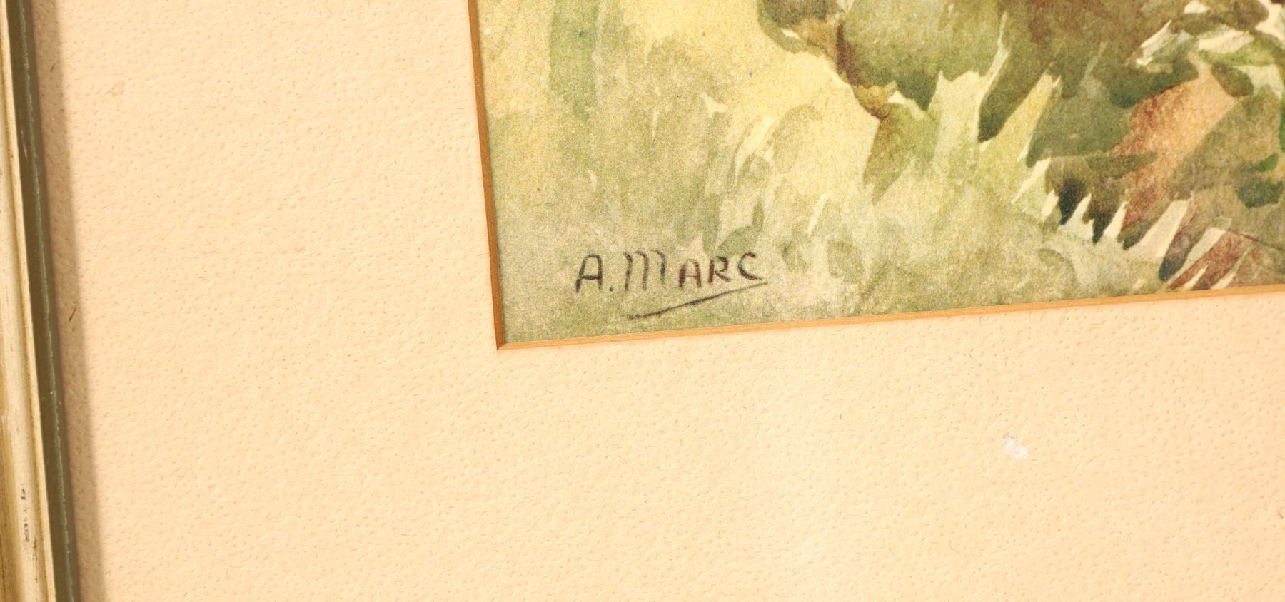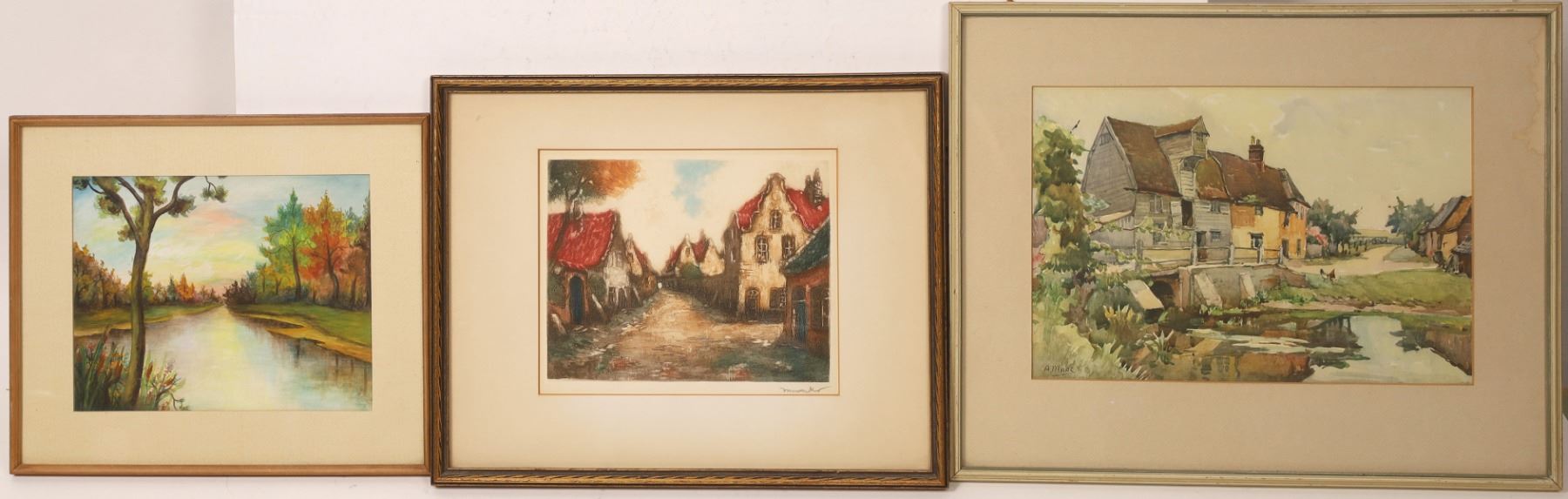 Three landscape paintings: 1) Image of quiet stream in Fall season. 2) Street through village. 3) Painting of barns and chickens on pond by A. Marc--also known as Nicolas Markovitch (Serbian-French, 1894-1964), artist. Marc was a watercolorist, and also an illustrator for books and an architect.