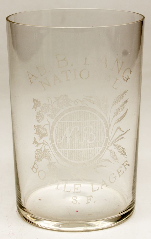 Very interesting Ad. B. Lang / National / Bottle Lager / S. F. Trademark in middle. Etched. 3 1/2". Burt collection