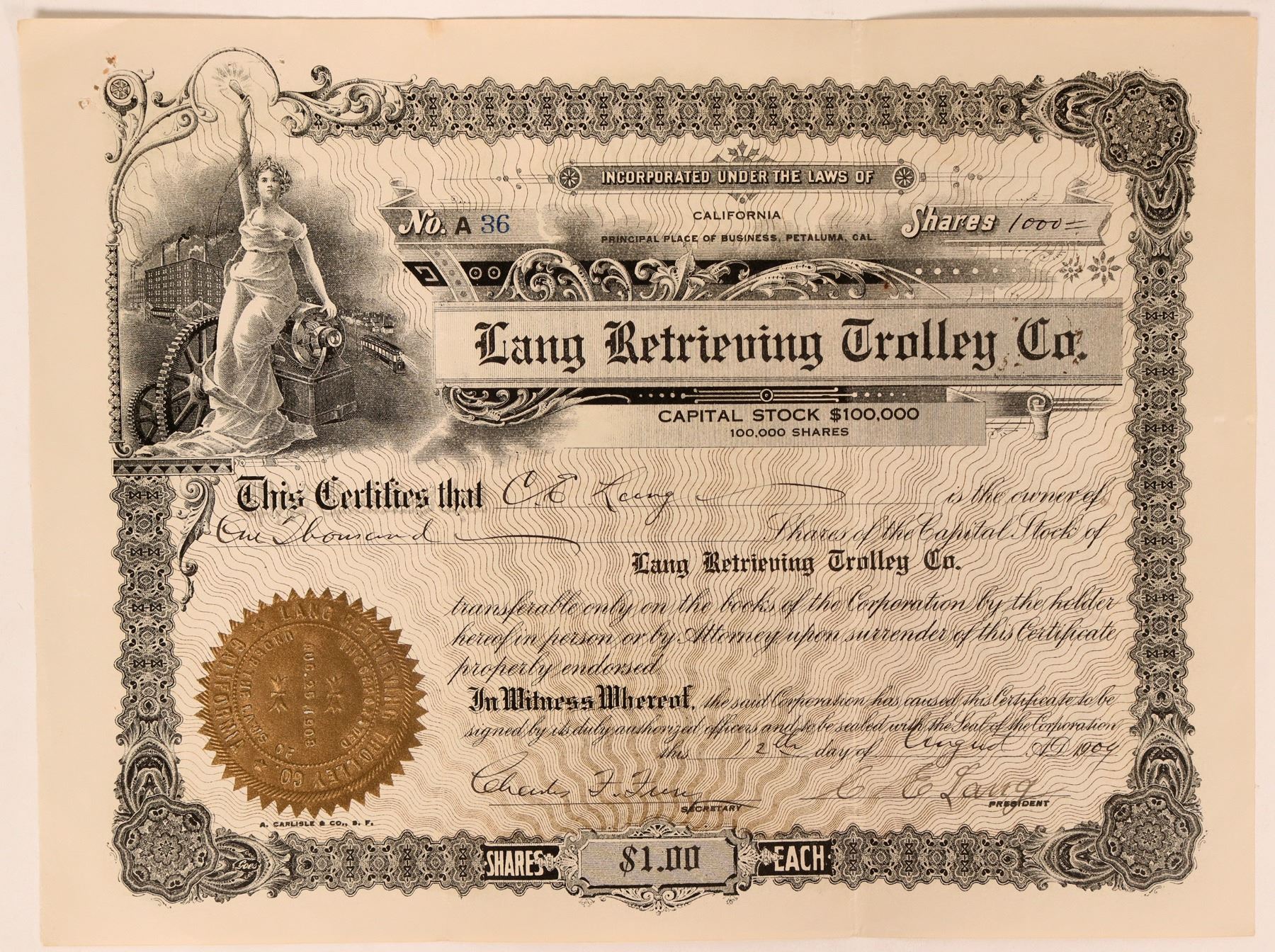 Interesting stock issued in 1909 and signed by company president C.E. Lang. The Lang Retrieving Trolley Company manufactured trolley bases, catchers and retrievers. Lang assigned his patent for his retrieving trolley to Wasson Engineering & Supply Co., Santa Rosa, in 1915. The retrieving trolley lowered the trolley pole when the trolley wheel leaves the wire. Interesting railroad certificate and very rare. Principal place of business: Petaluma, California printed on the certificate, but by 1915, the company was operating at Santa Rosa, California. Pinholes at top left corner, so VG. Uncancelled.
