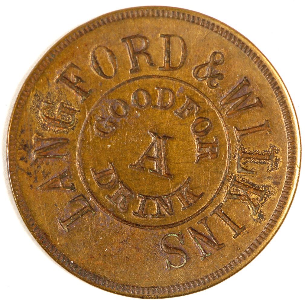 Round brass 24mm LANGFORD & WILKINS / GF A DRINK // BLANK. Atrributed to Worthington. Unlisted token. HWAC# 62366 Date: Location: Winona, Texas