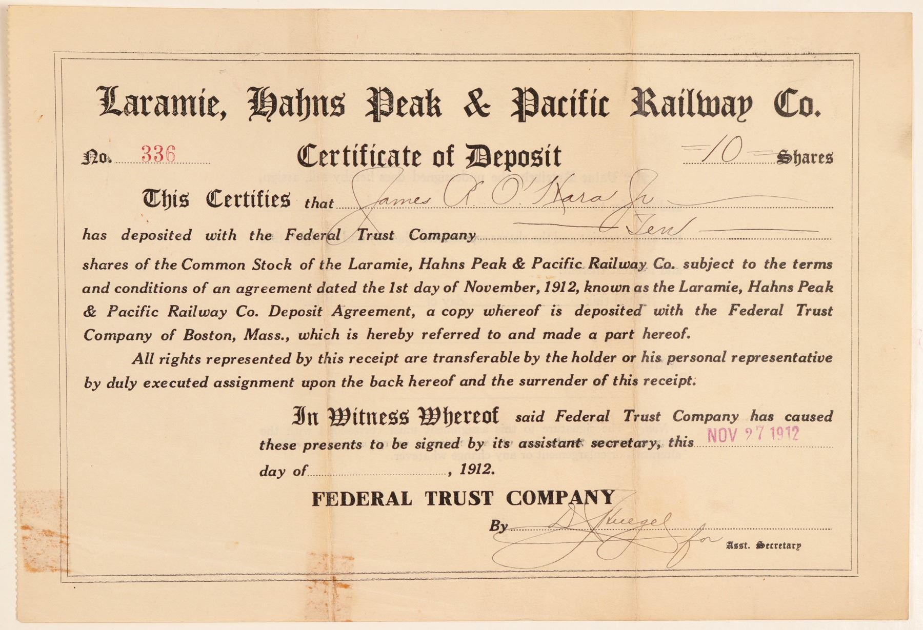 Stock Certificate from the Laramie, Hahns Peak & Pacific Railway Co. Certificate number 336 issued in 1912 to James O' Hara Jr. Signed by president Kuegel. Size 9.5 by 6.5 inches. Staining bottom center and bottom left. Not cancelled. This is a certificate of deposit with the federal trust company. Common stock. Plain certificate. Organized in 1901 by Isaac Van Horn who wanted to build a railroad to the mining camps of Gold Hill and Centennial located west of Laramie. They did not reach Centennial until 1907, when mining had already declined. They decided to turn south and build toward North Park, Colorado. The company bought a coal deposit near Walden and created the camp of Coalmont. The line reached Walden and Coalmont in late 1911, but it was too expensive to maintain, so they sold to Colorado, Wyoming and Eastern Railroad in 1914.
