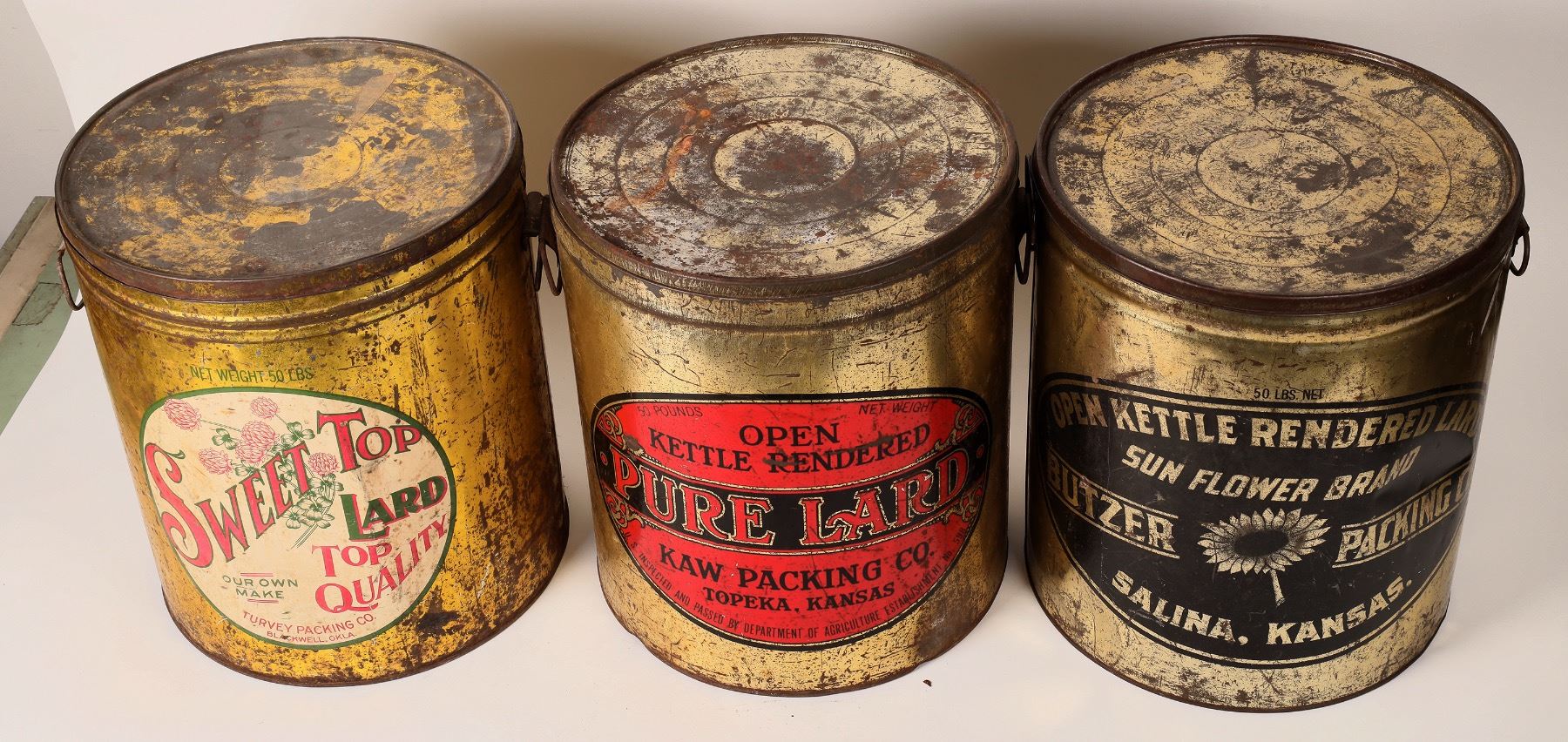 Three (3) large 50 pound canisters that once held lard. The brands are Sun Flower of Salina, Kansas, Kaw Packing Company of Topeka, Kansas and Sweet Top of Blackwell, Oklahoma. These canisters measure 12"x 14" and have wear, but are still attractive and a sign of the early times. Please see photos for more details. Kansas