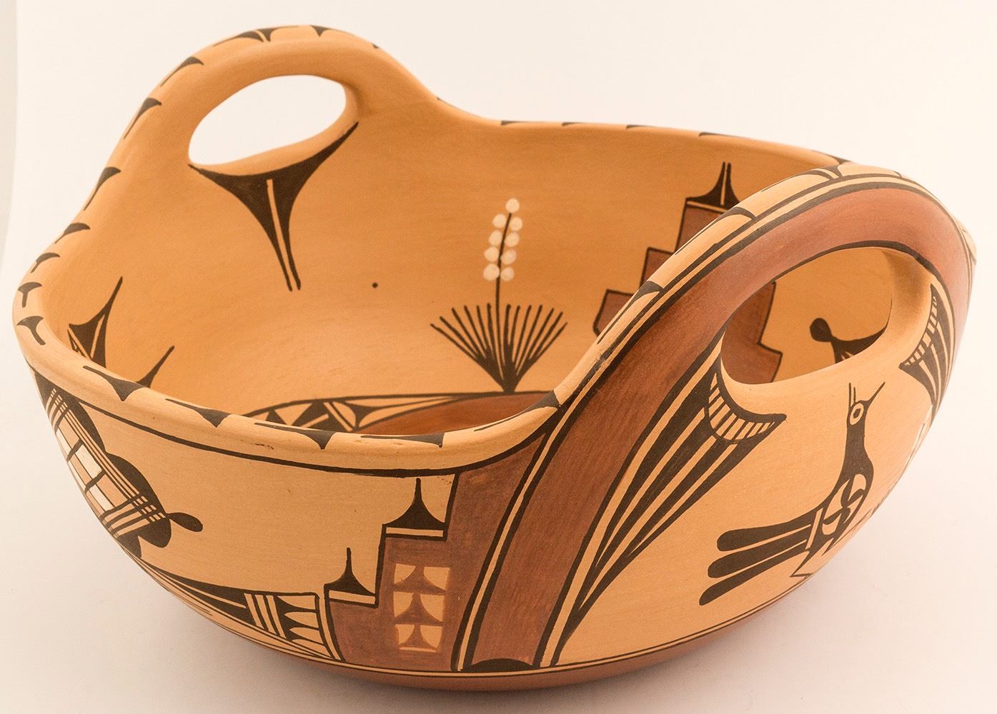 Polychrome two handled bowl with four direction bird, rainbow, cloud, cactus and geometric design by Eleanor Pino Griego. 6.5" h x 11.75" diameter. Excellent condition. Eleanor was born into the Coyote Clan at Zia Pueblo on April 7, 1953. She and her sister, Ruby Panana, learned the ancient art of pottery making from their grandmother, Ascencion Galvan Pino, and their mother, Laura Pino. Eleanor primarily creates bowls, jars and vases using the traditional Zia styles, forms and designs. Eleanor says, "her favorite pieces to create are large polychrome jars decorated with birds and flowers. We asked Eleanor where she gets her inspiration and she responded by saying she's very traditional: the pots call to her to be made. So she is anxious to make them with prayers to Mother Nature and the clear realization that she is her pots and they are her." Date: Location: Zia Pueblo, New Mexico HWAC # 49349