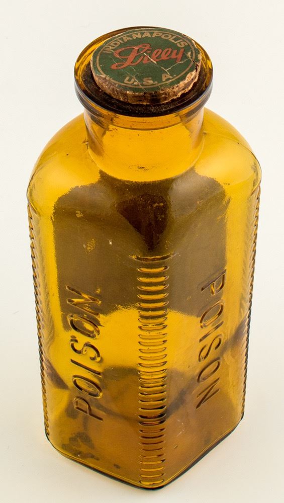 Large size amber embossed poison made by the Lilly Company, c 1900-1920. This large poison is a choice bottle. 10.25" tall with the original top and original paper label; the paper label is difficult to read. Never been in the ground. Clean, bright and vibrant, problem free as best we can tell, Please inspect. City: Indianapolis State: Indiana Inventory Number: 38959